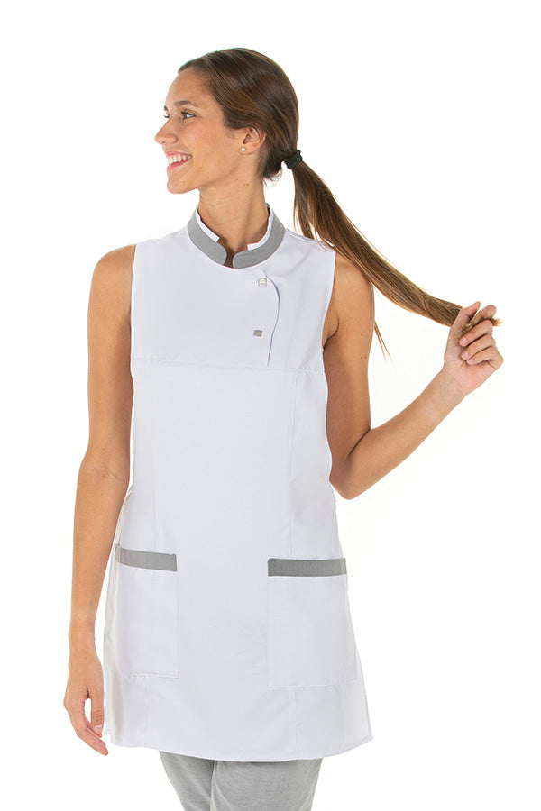 Avental para comércio e estética em tecido microfibra. Detalhe na gola e bolsos. Gola mandarim com abertura com colchetes. Tamanho único. Aperta com botões ajustáveis em ambos os lados para obter um efeito mais ajustado. Peça muito leve, confortável e macia ao toque. Comprimento: 80 cm.
