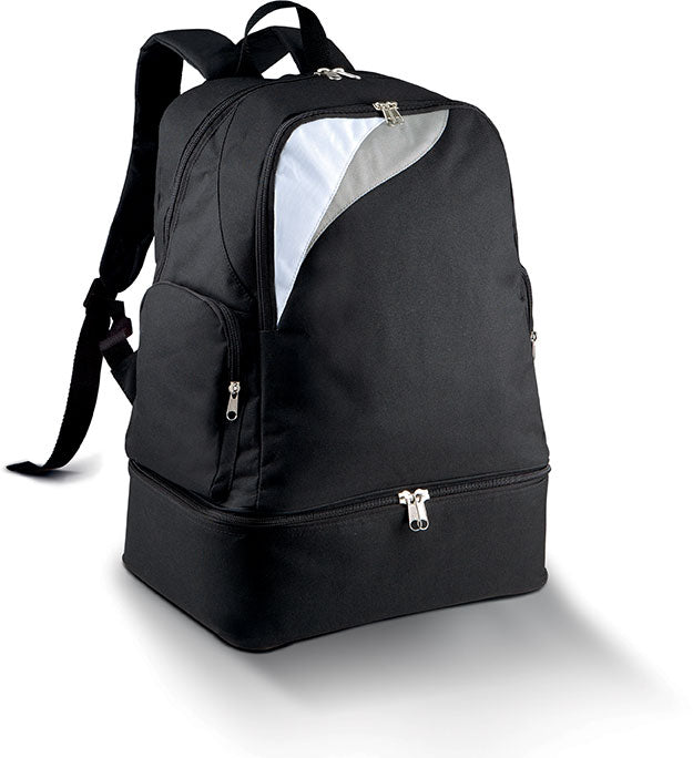 Mochila para desporto (equipas) em poliéster 600D. fundo rígido ideal para sapatos. bolso frontal grande. bolsos laterais com fecho. Dimensão 35 x 46 x 24 cm