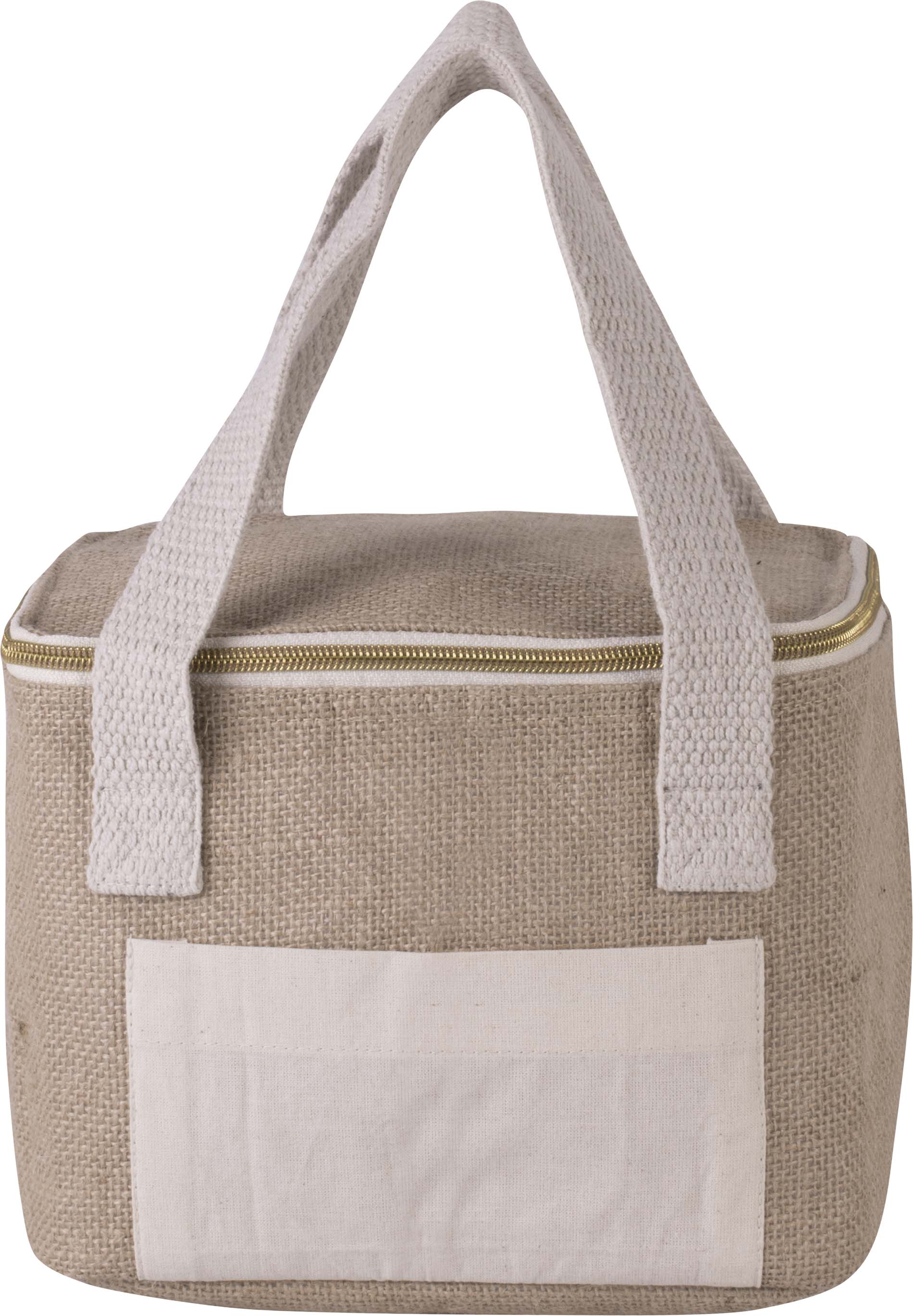 Saco isotérmico com exterior em juta e bolso em algodão para facilitar a personalização. interior isotérmico com revestimento isolante em alumínio e espuma isotérmica de alta densidade. Pegas em algodão. Modelo pequeno. Gramagem Dimensão 20 x 15 x 15 cm