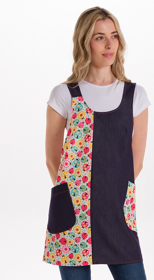 Feito com tecido de ganga elástica fina, este avental combina conforto e estilo, com uma charmosa impressão de joaninha que encanta crianças e adultos. Os bolsos de contraste em ambos os lados oferecem praticidade para levar itens essenciais durante o dia.