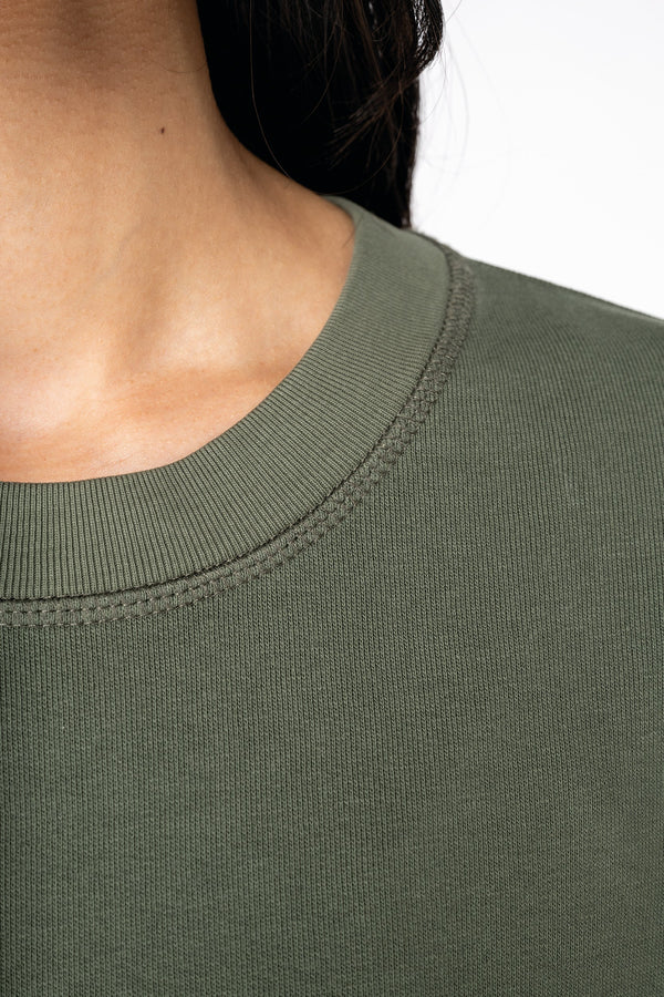 Fabricada em Portugal. Algodão penteado ringspun. Corte justo. Banho de enzimas. Interior não cardado (French Terry). Meia-lua nas costas. Ponto de recobrimento no decote,nas cavas, nos punhos e no cós. Malha rib 1 x 1 nos punhos, no decote e no cós. Decote com tapa-costuras no interior em chevron. Peça de vestuário tingida após montagem: as cores podem variar ligeiramente de uma peça para outra. Este produto é susceptível de tingir em contacto com superfícies ou peças de roupa claras.