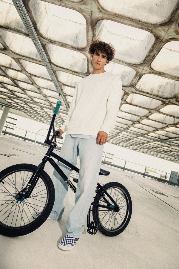 Algodão penteado. Corte direito com ombros descaídos. Interior 3 fios não cardado em French Terry. Meia-lua nas costas. Com banho de enzimas. Malha rib 2 x 1 no decote, nas mangas e na bainha, montagem tubular para melhor acabamento. Tapa-costuras em jersey tom sobre tom no decote. Acabamento costura dupla nos ombros, nas cavas, nas mangas e na bainha.