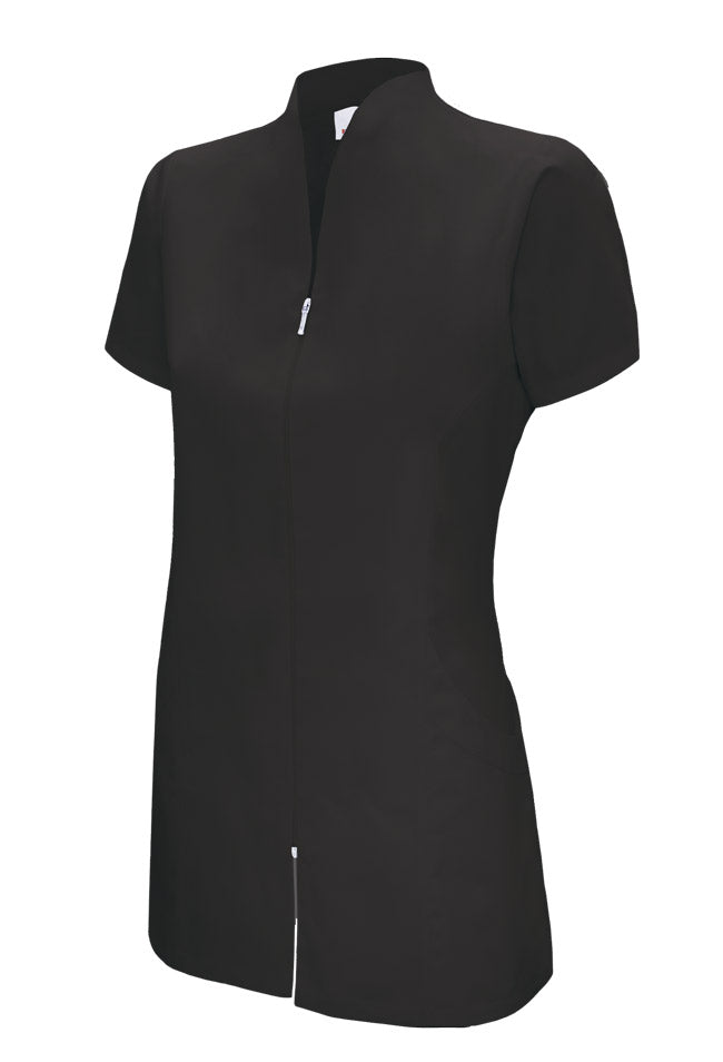 Fecho-ecler central.Gola chaminé.Pinças nas costas.Semicintado.Manga curta..Dois bolsos:.2 bolsos inferiores de remendo Sarja. 65% poliéster - 35% algodão Gramagem 190 gr/m2 Dimensão