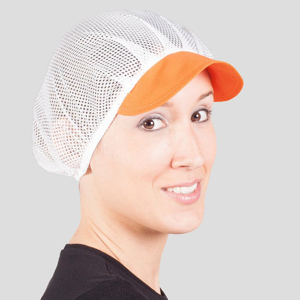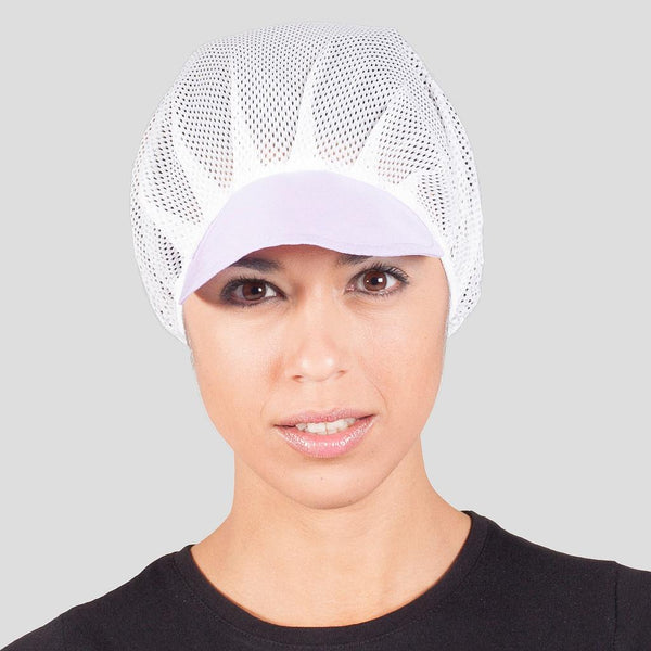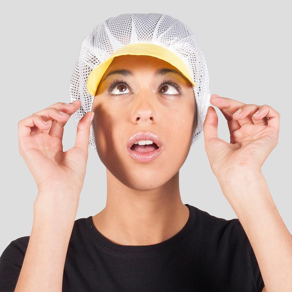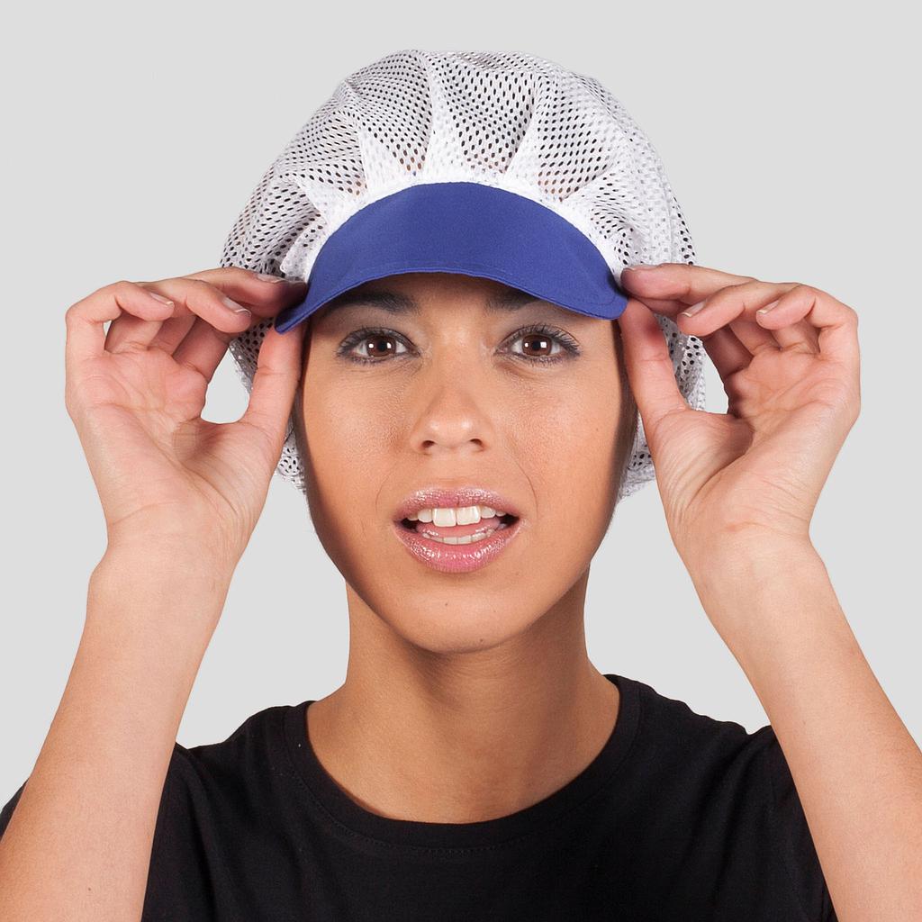 Boné unissexo com malha branca e viseira colorida semirrígida. Escolha de 17 cores de viseira. Possui elástico na parte de trás para prender os cabelos de forma confortável. Ideal para uniformes de hotéis e restaurantes, alimentação, almoxarifado, cozinha, limpeza ou comércio.