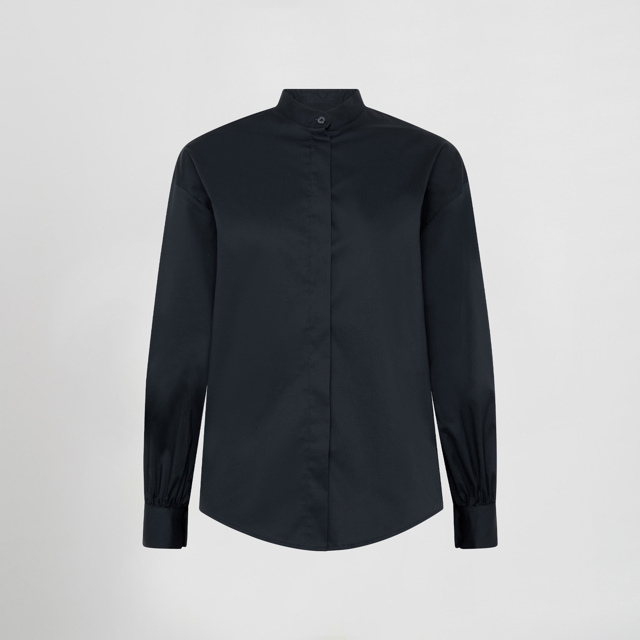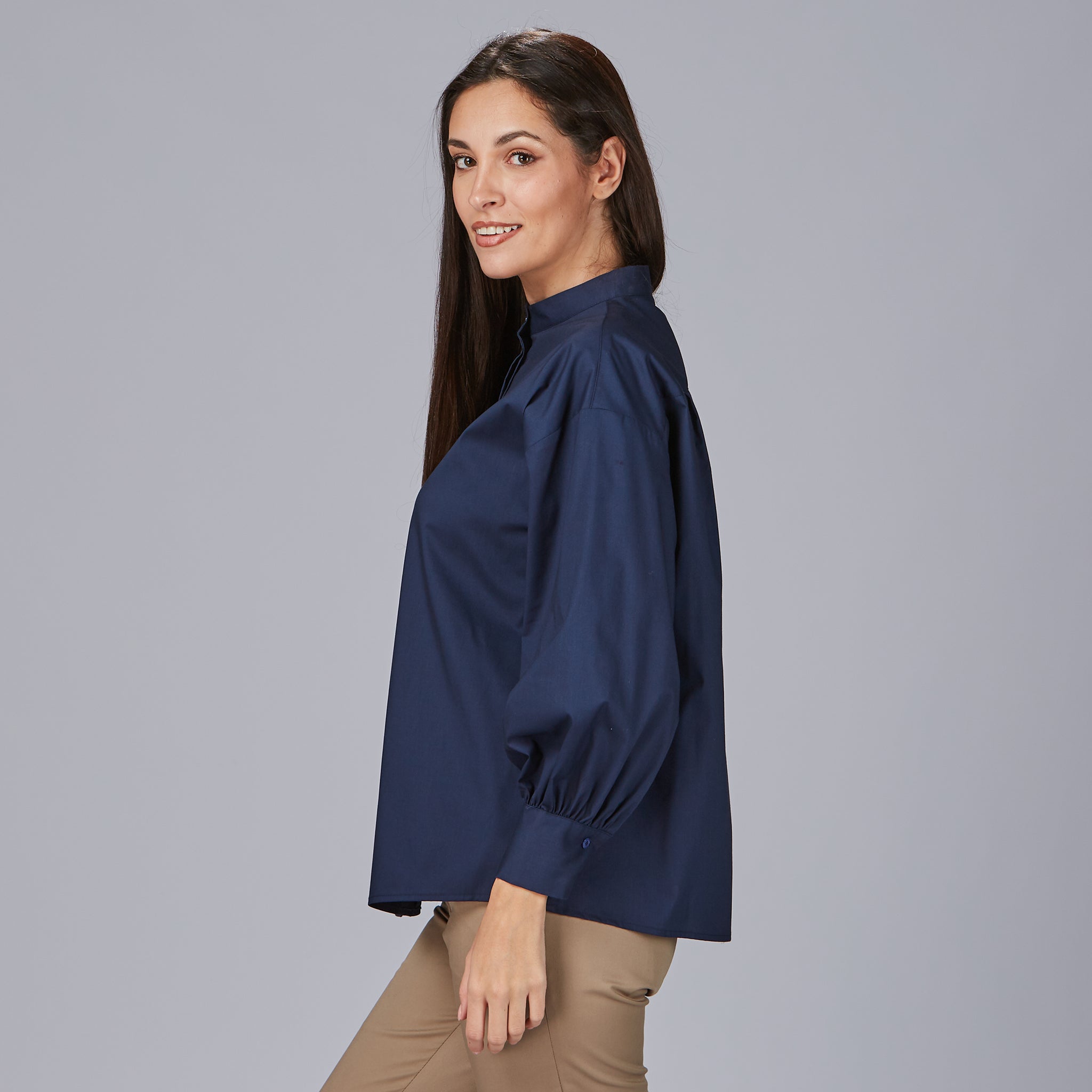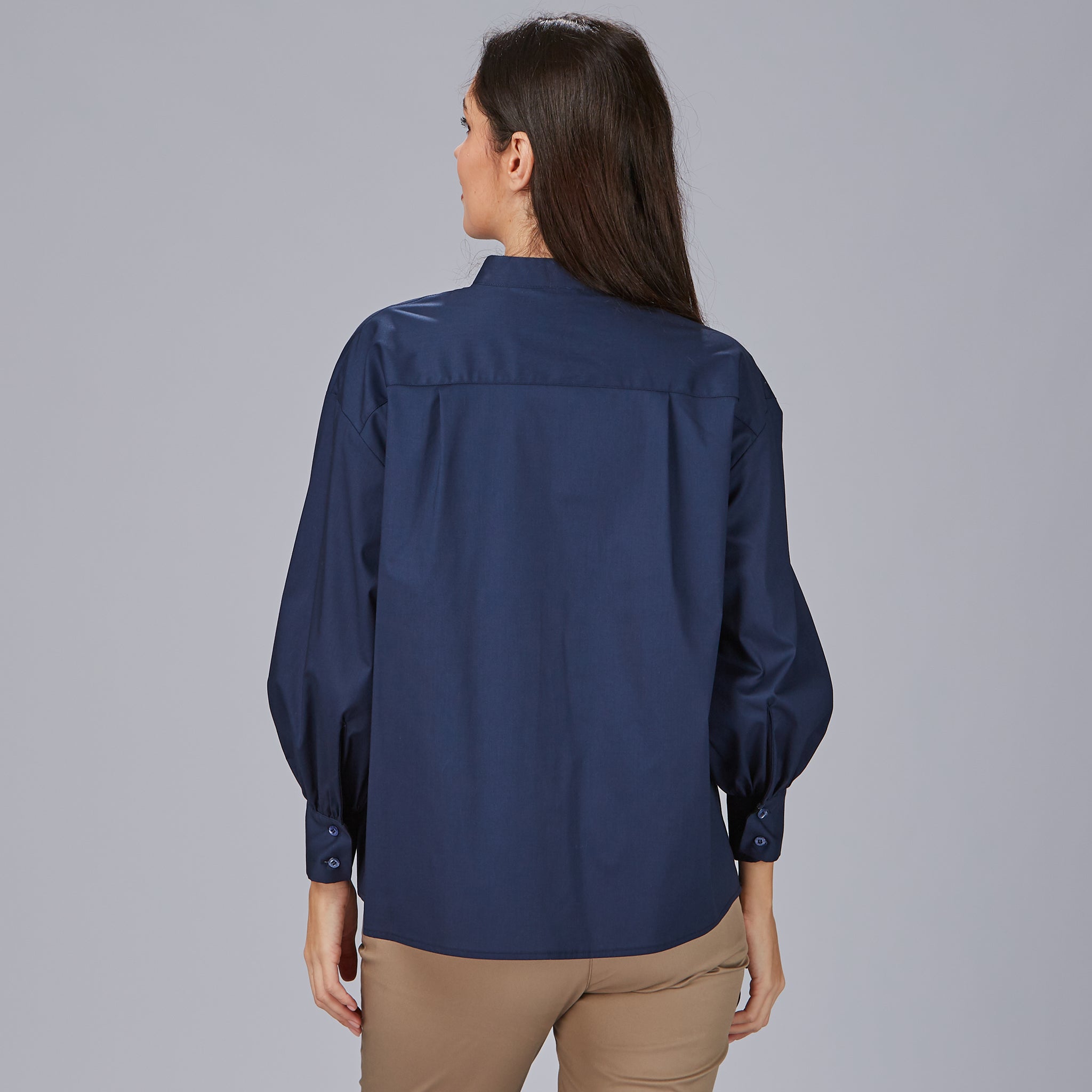 - Mangas compridas abalonadas: Levemente volumosas, com abertura no punho e fecho com botão, garantindo um toque de feminilidade subtil.