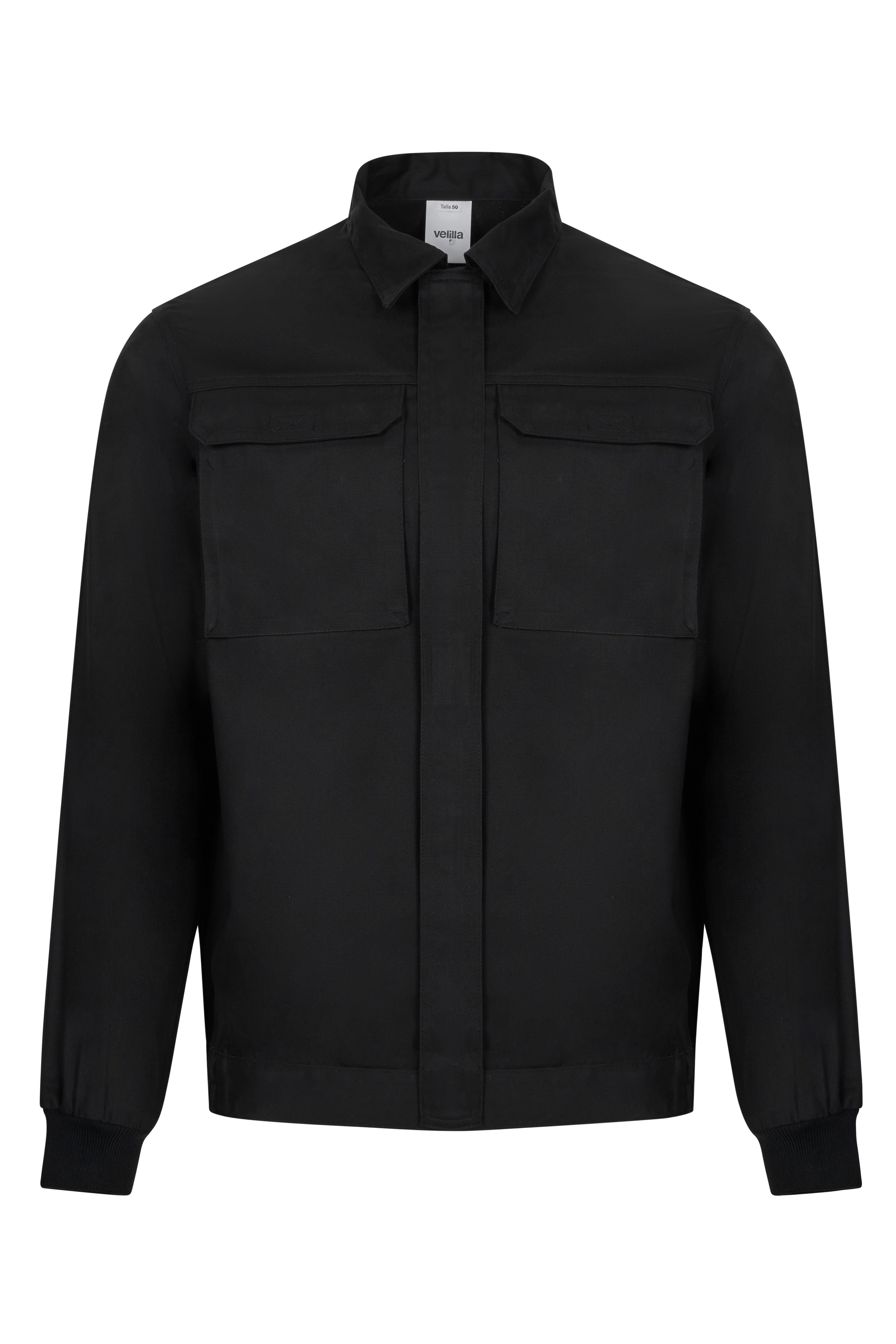 Zentraler Reißverschluss, verdeckt mit Klappe. Flach mit Klettverschluss. Seitlicher elastischer Bund. Gerippte Bündchen. Schulterblatt vorne und hinten. Zwei Taschen: 2 Blasebalgtaschen auf der Brust, mit Klappe und Twill-Klettverschluss. 100 % Baumwolle. Gewicht 240 g/m2. Maße