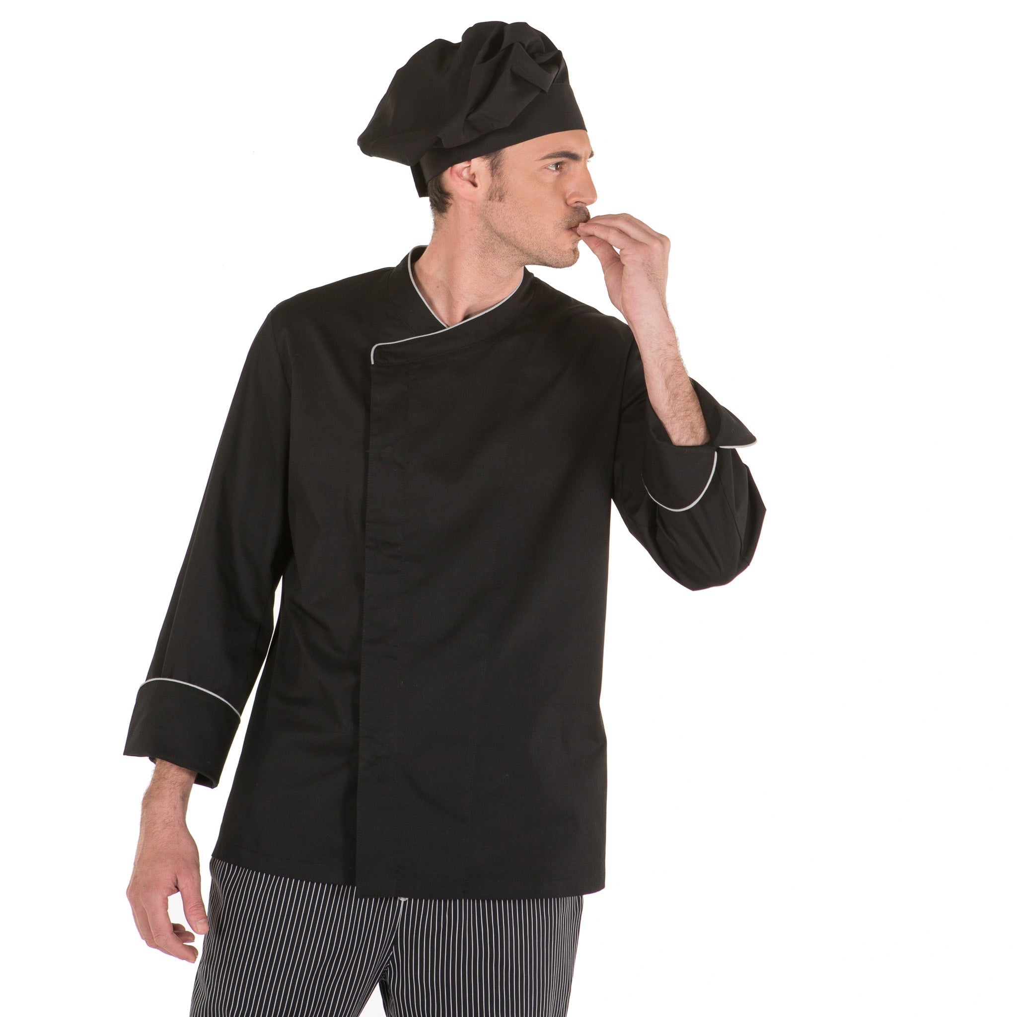 ARBEITSJACKE FÜR HERREN (MIT GROßEN GRÖSSEN) Langarm mit umgeschlagenen Bündchen, Tasche am linken Ärmel und verdecktem Druckknopfverschluss. Halb tailliertes Teil mit Rippen auf der Rückseite. Hergestellt aus weißem oder schwarzem Twill, kombiniert mit kontrastierendem Kragen und Manschetten. Auf der Rückseite ist das technische AEROSILVER-Gewebe verwendet. Ideal für Uniformen für Kellner, Köche und Köche in Hotels, Restaurants und Küchen im Allgemeinen.