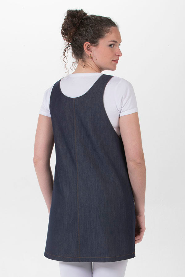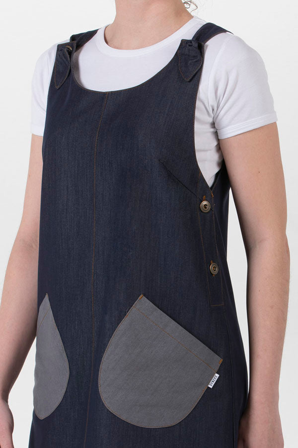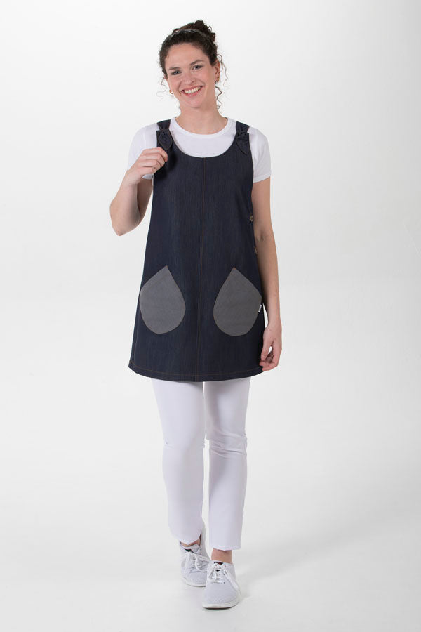 Pichi confeccionado em jeans macio com alças ajustáveis com nó e ilhós de metal cobre antigo. Aperta num dos lados com 2 botões de latão antigo. Dois bolsos inclinados em tom de ganga suave.
