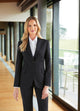 - Design: 3 botões frontais, single breasted (abotoamento simples), com abertura central nas costas.