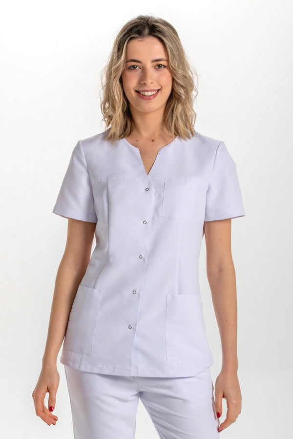 Damen-Tunika aus Mikrofaser. Kurzarm. Tailliertes Teil mit Haken- und Ösenverschluss und Steppnähten auf der Brust. Es hat zwei untere Taschen und eine auf der Brust. Länge: 70 cm. Größe: SP-PMG-SG-SSG-XL. Weicher Stoff im Griff, sehr leicht und leicht zu bügeln.