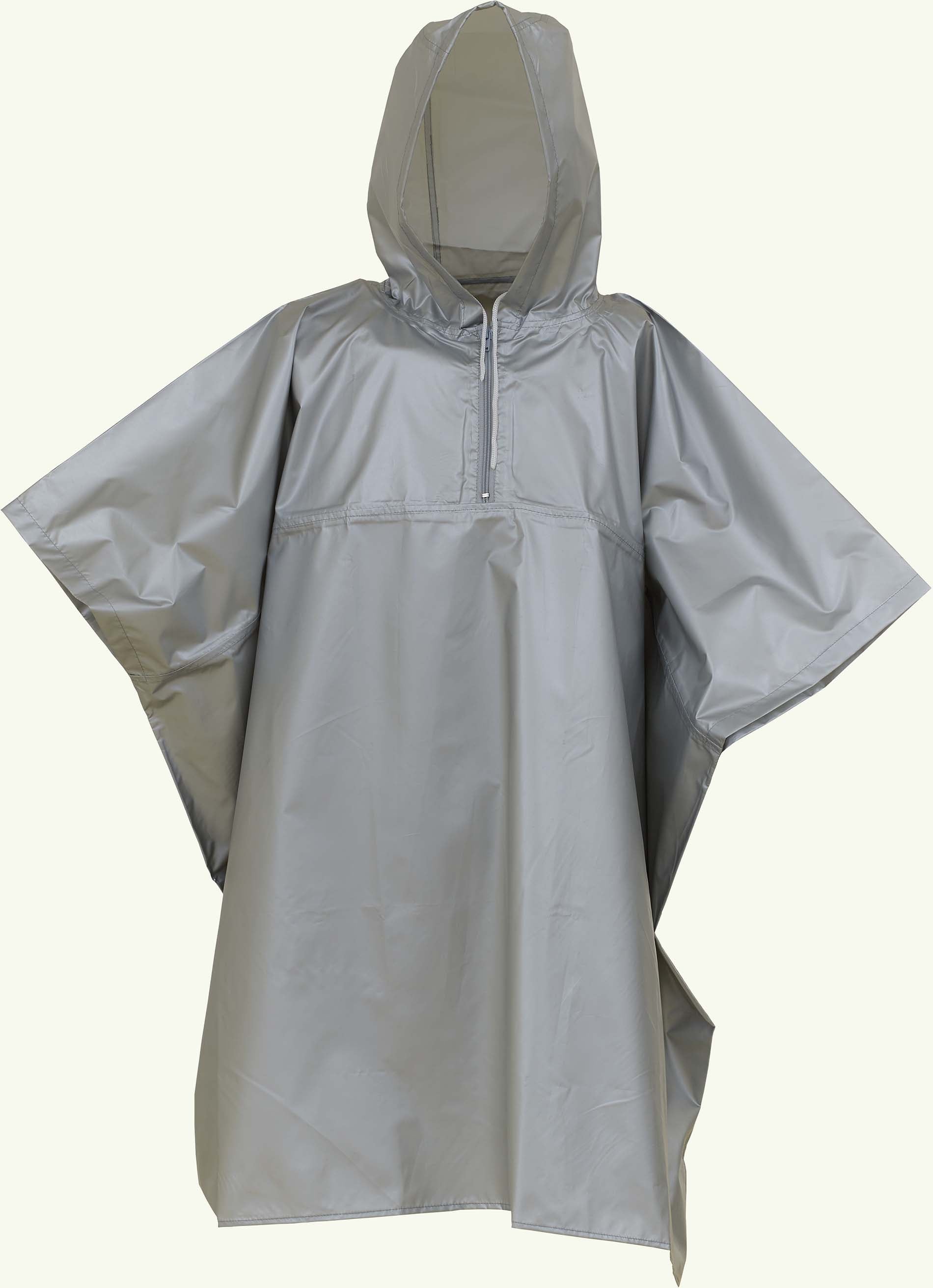 100% polyester with PU coating. Heat-sealed interior seams. Collar with half-zip and hood. Storage system with colored bag. Weight 190 g/m². Dimensions.