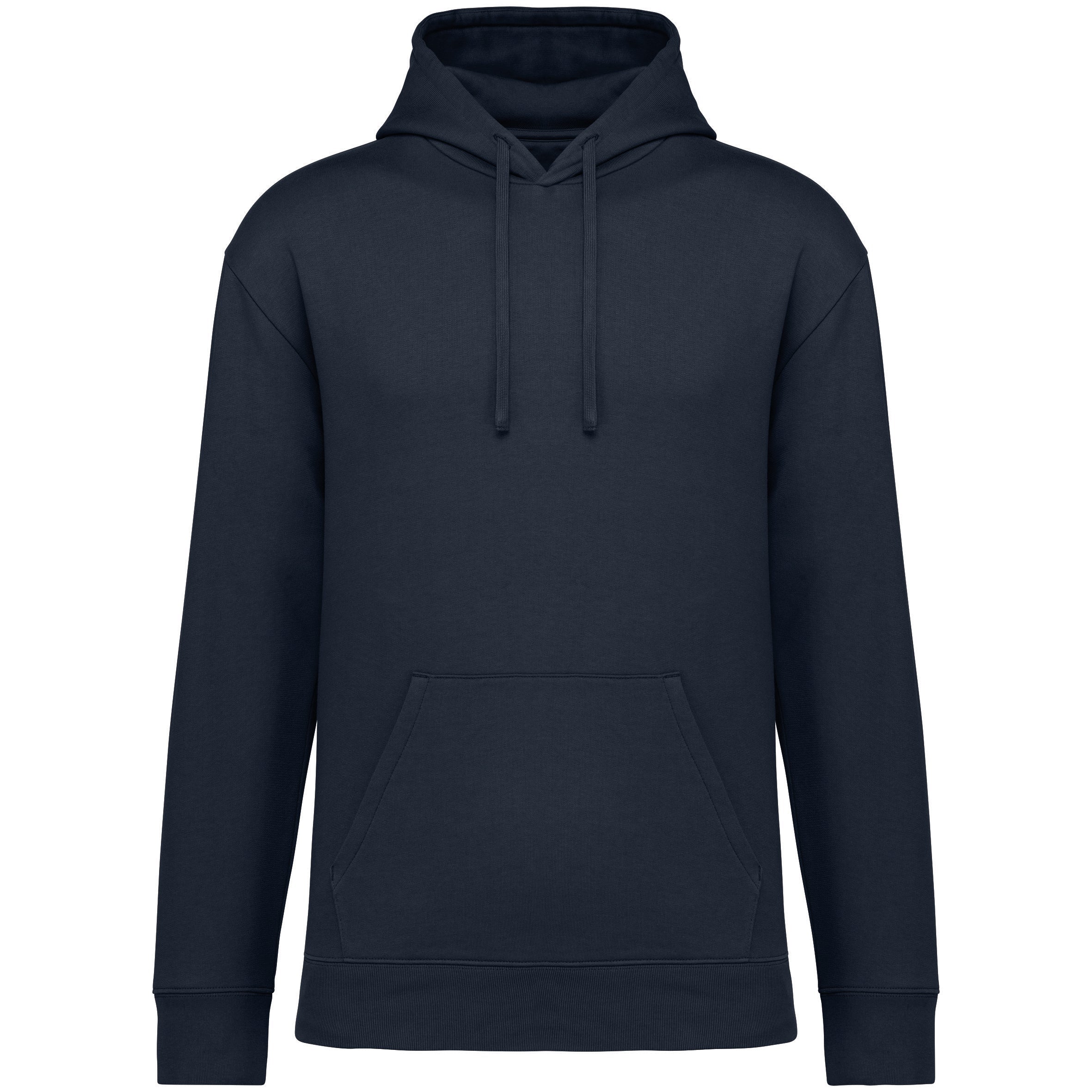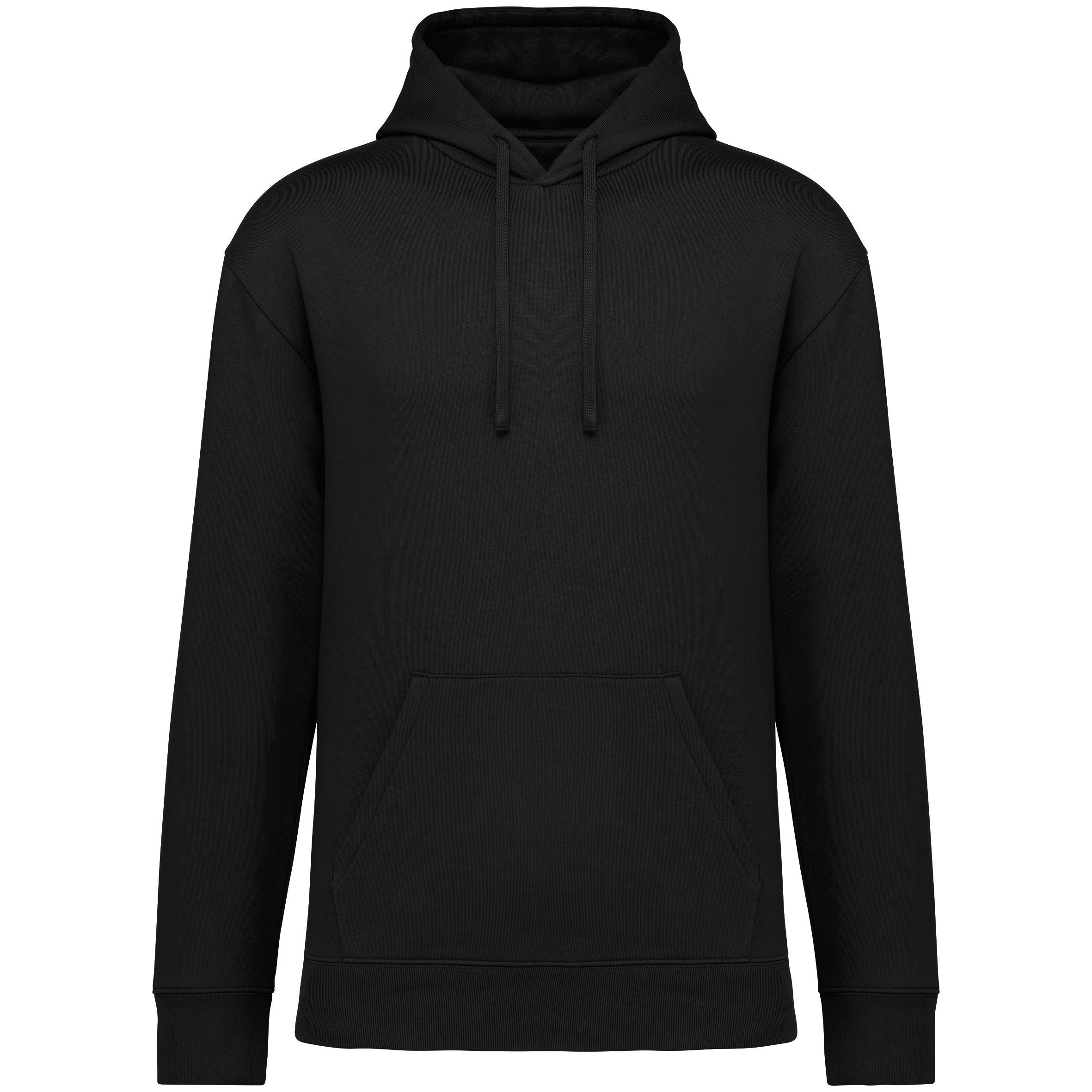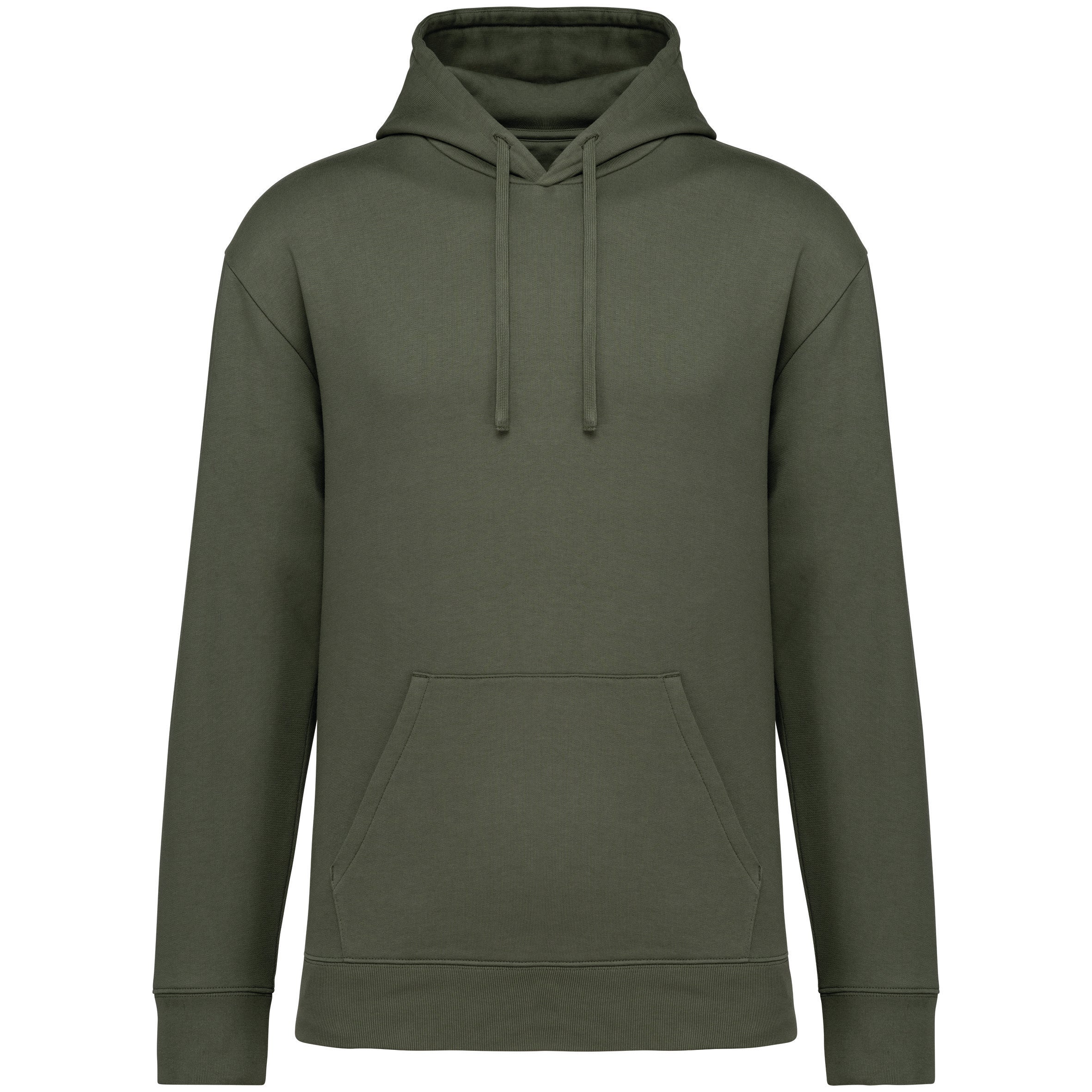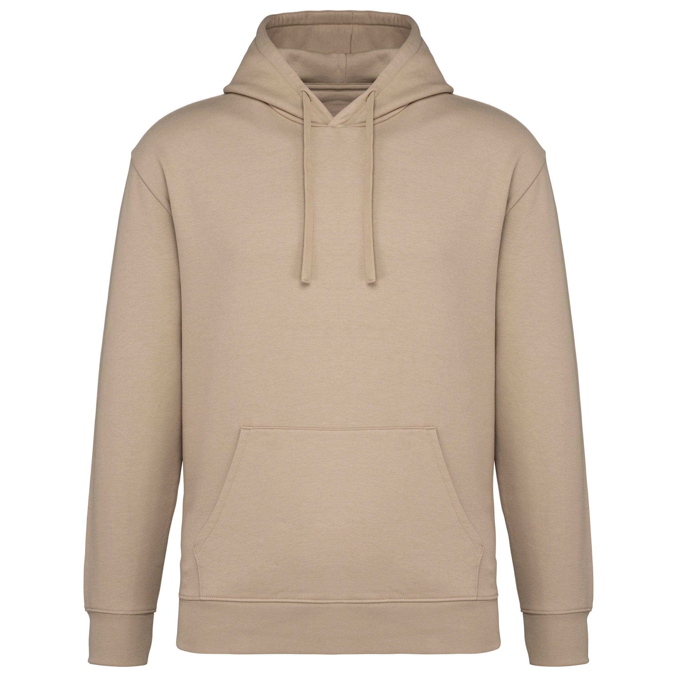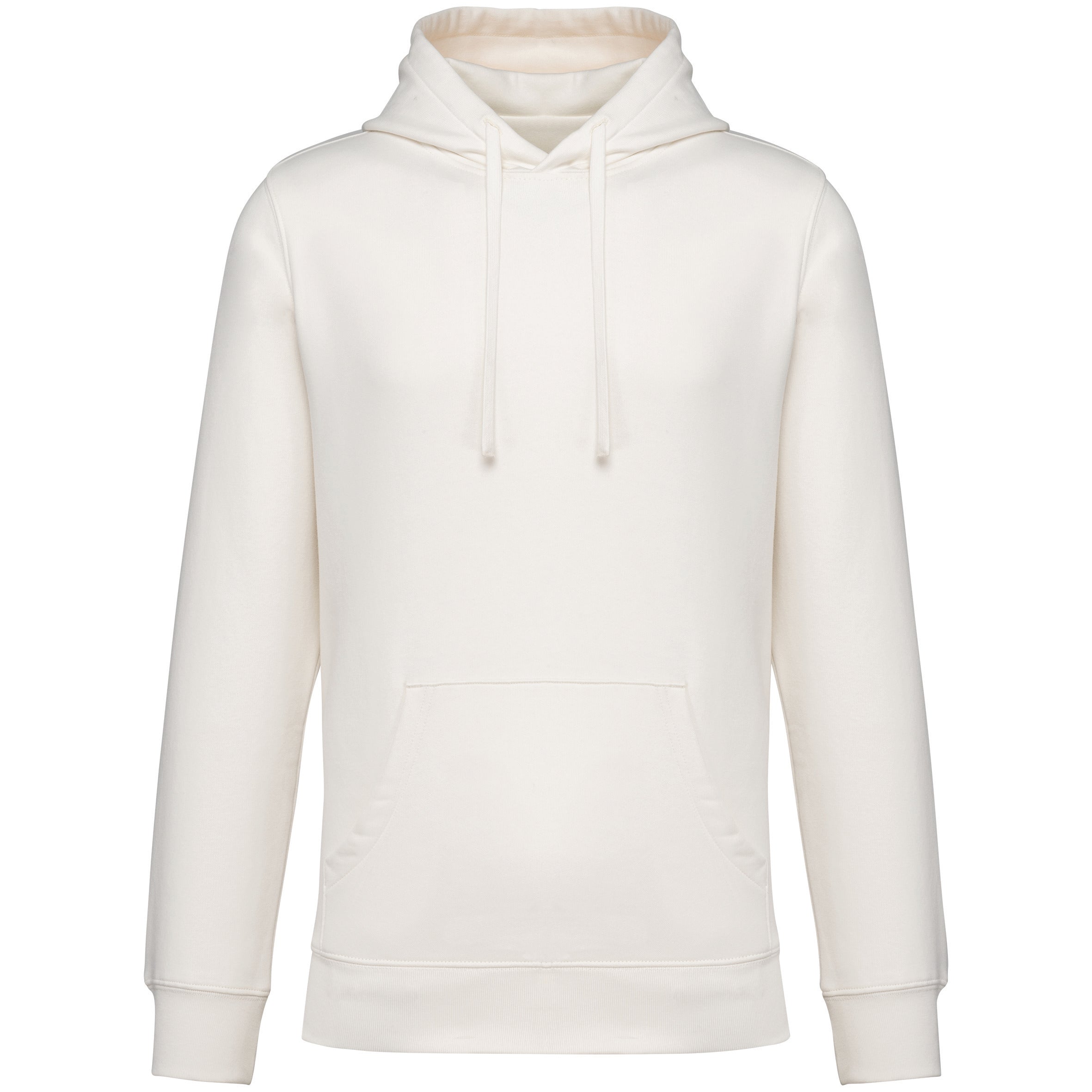 Combed cotton. Straight cut with dropped shoulders. Enzyme-treated. 3-ply carded interior. Half-moon opening at the back. Kangaroo pocket. Hood lined in tone-on-tone main fabric. Topstitching around the hood to secure the drawstring. Flat drawstring in organic cotton with topstitching. Tone-on-tone jersey tape inside the neckline. Ribbed 1x1 knit cuffs and waistband, tubular construction for a better finish. Simple topstitching at the pocket opening.