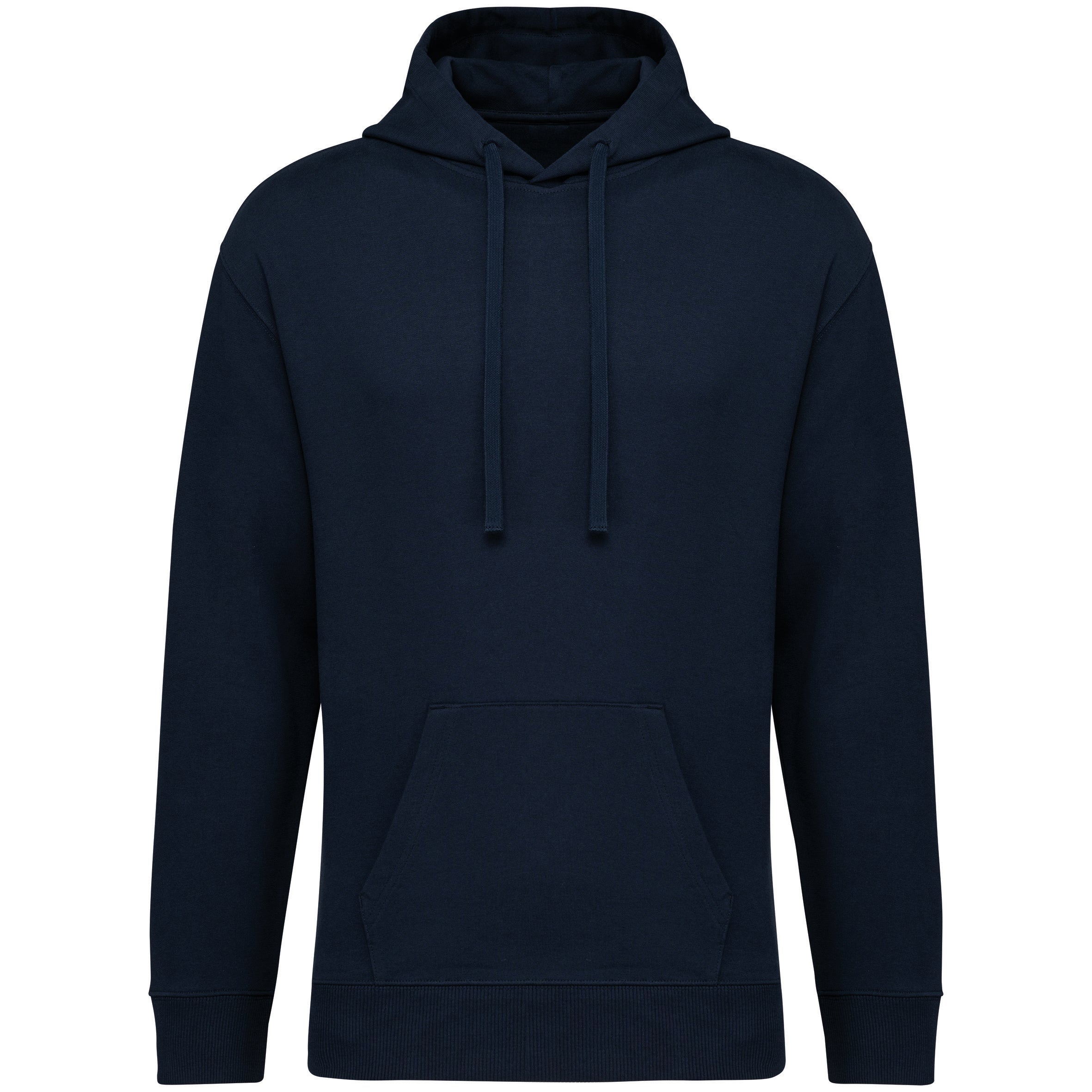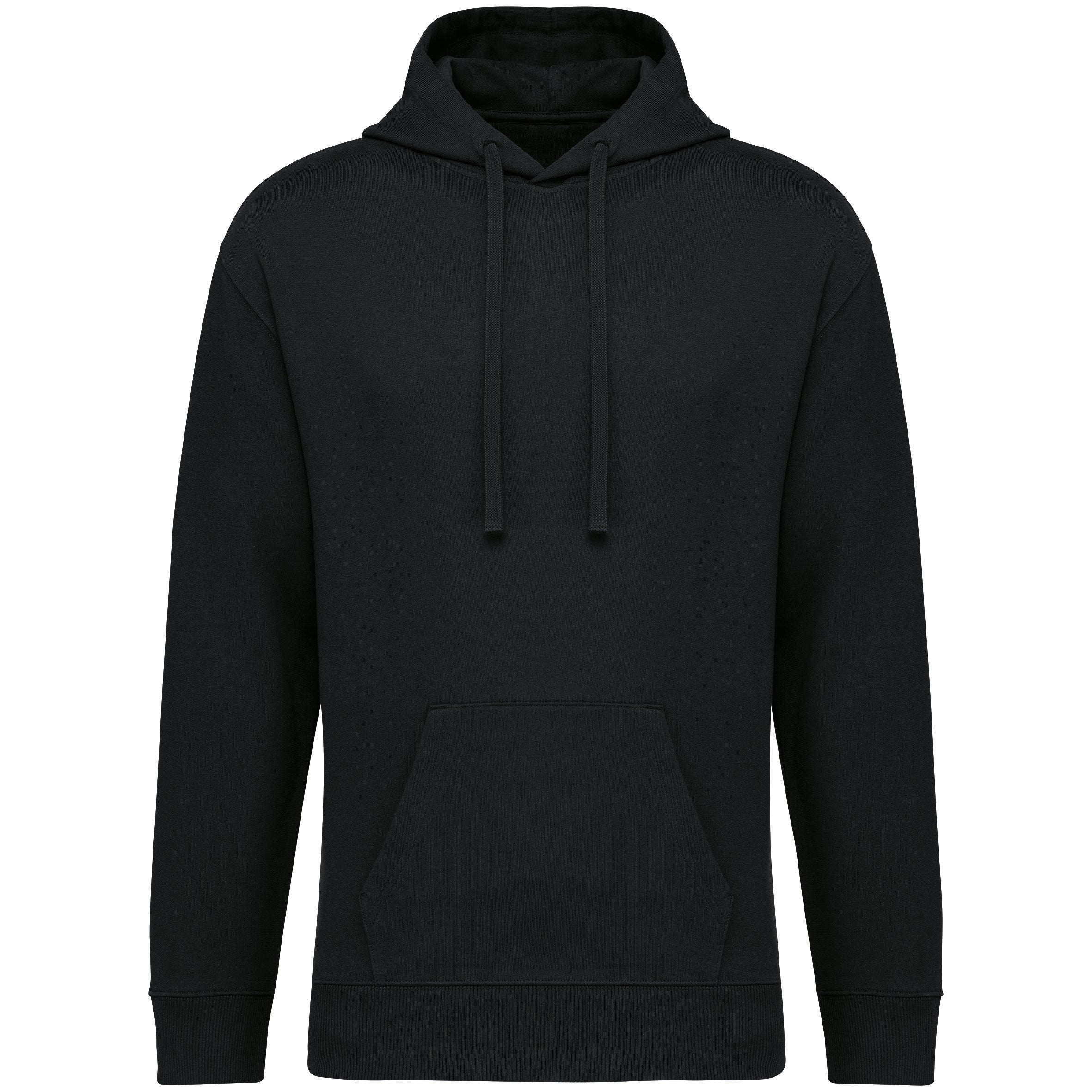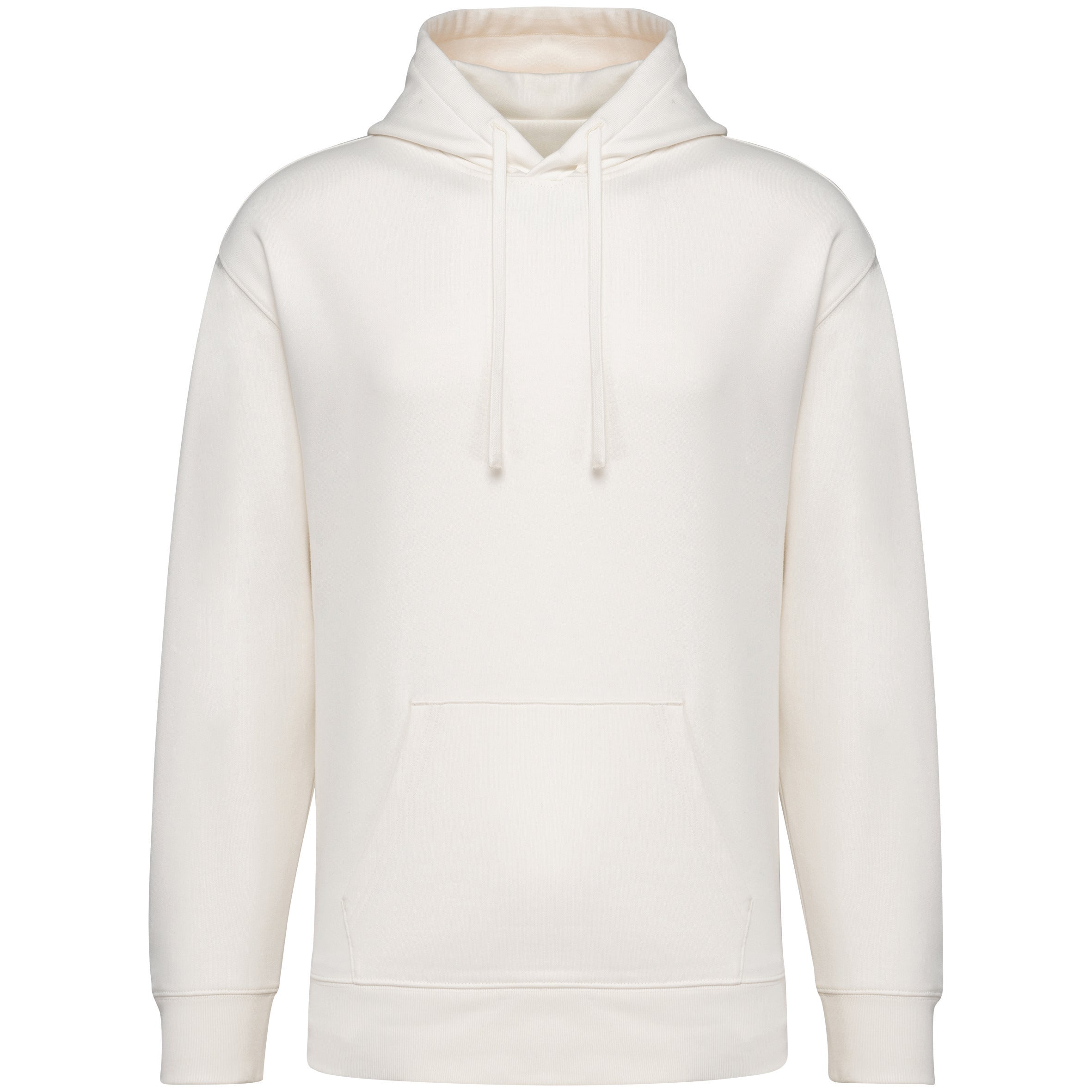 100% organic cotton. Combed cotton. Straight cut. with slumped shoulders. Interior 3 strands in French Terry. Half moon on the back. Kangaroo pocket. With enzyme bath. Hood lined in tone-on-tone main fabric. Topstitching around the hood to secure the drawstring. Flat cord in organic cotton with stitching. Seam covering in tone-on-tone jersey on the inside of the collar. 2 x 1 rib mesh on cuffs and hem, tubular assembly for better finish. Double stitching finish on the shoulders, armholes, kangaroo pocket openings, cuffs and hem.