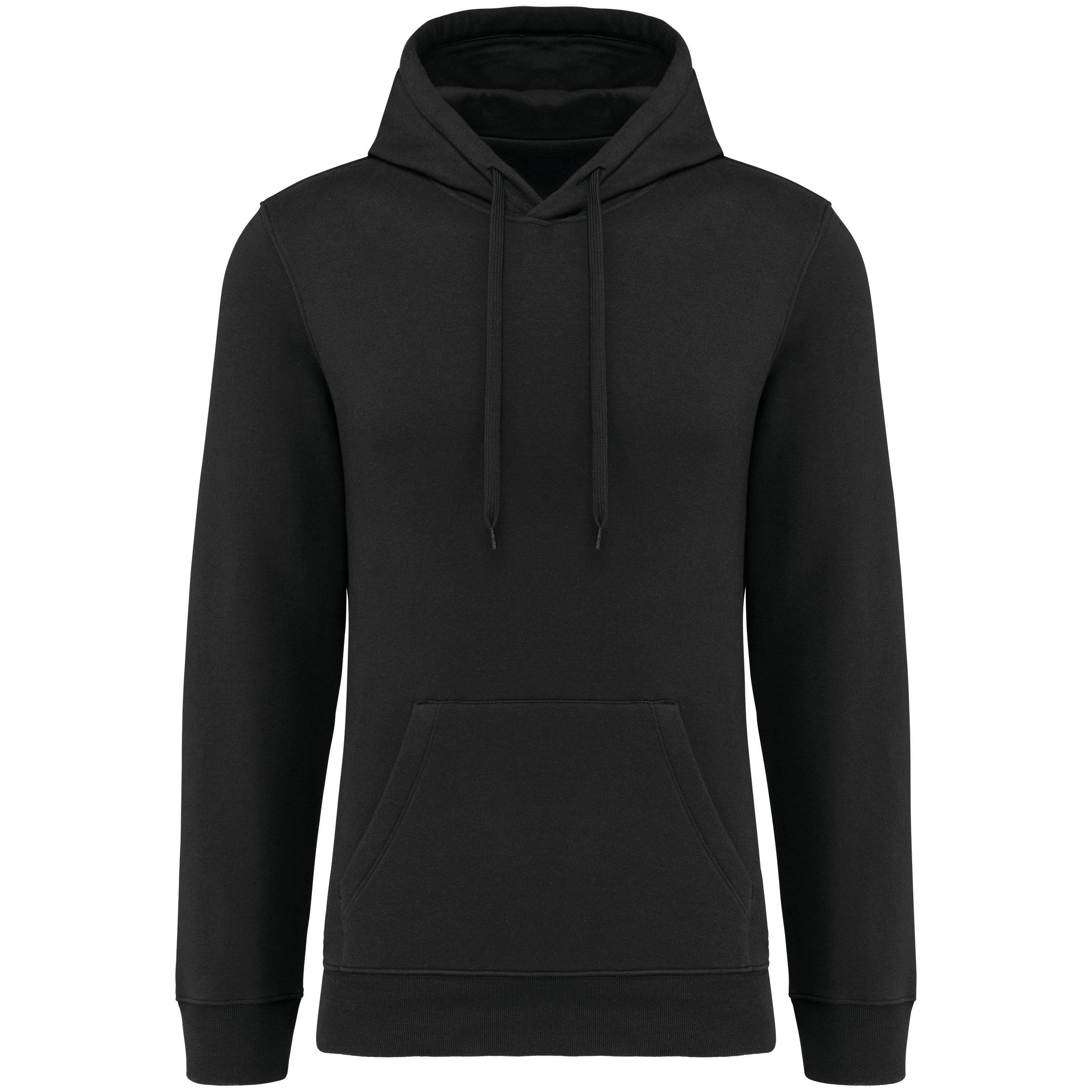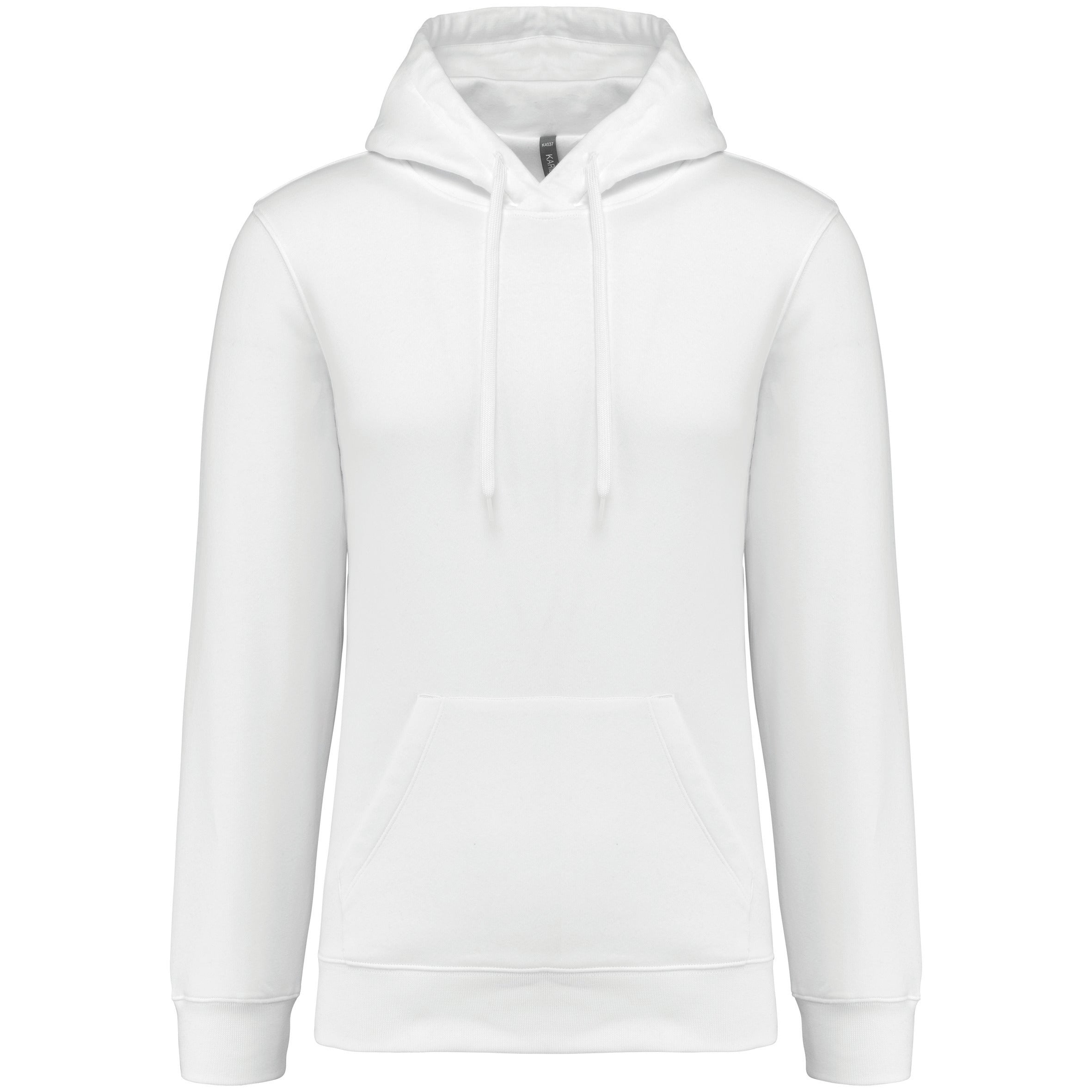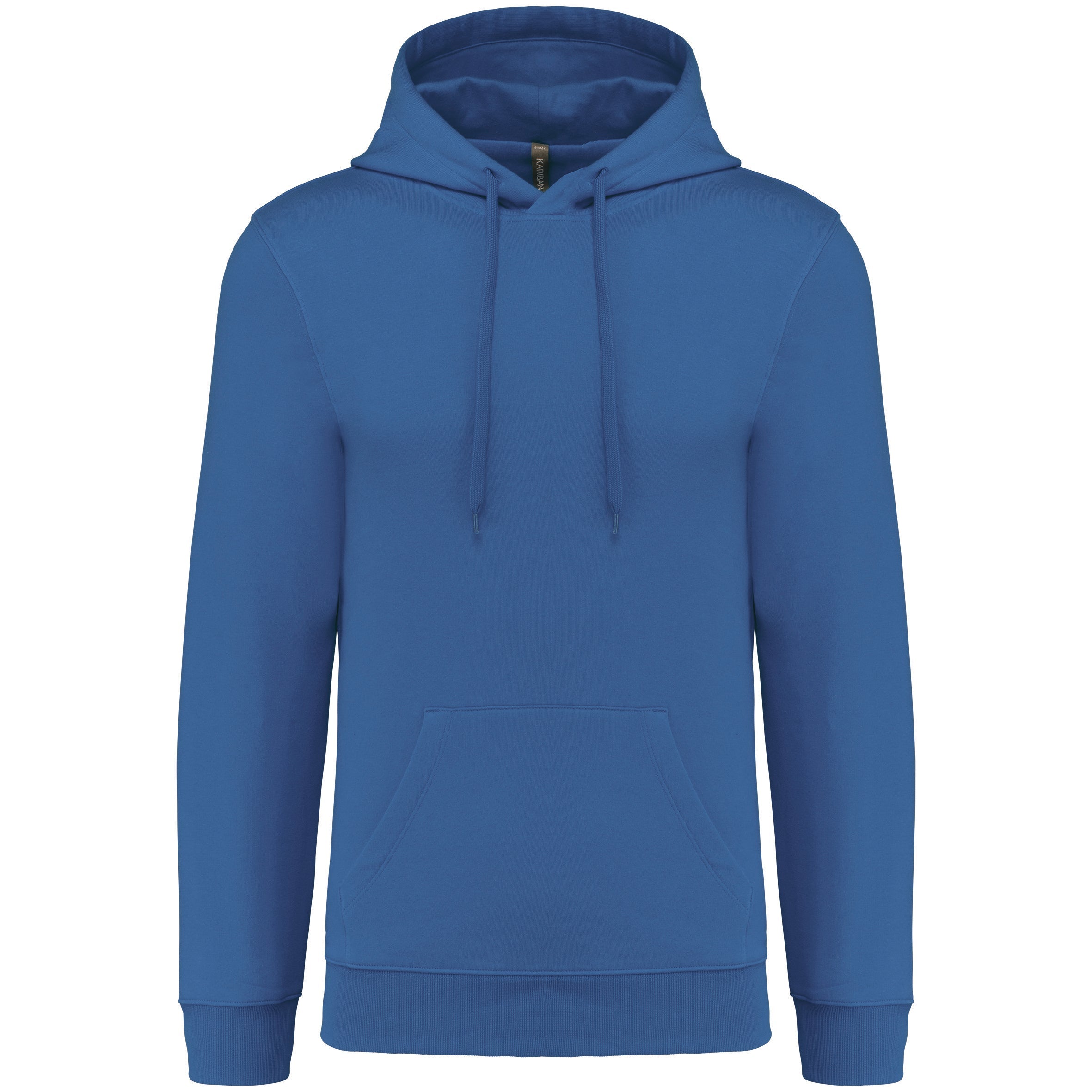 80% cotton/20% polyester. 3-ply LSF (Low Shrinkage Fleece) interior with anti-pilling treatment. Made in Portugal. Straight cut. Round neck. Cut and sew construction. 1 x 1 rib knit tubular construction for better finishing of cuffs and hem. Kangaroo pocket. 100% cotton jersey lined hood with flat drawstring and button eyelets. Half-moon finish on the inside of the neckline. Double stitching on cuffs and hem. No brand label, only size indication to facilitate customization.