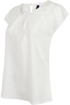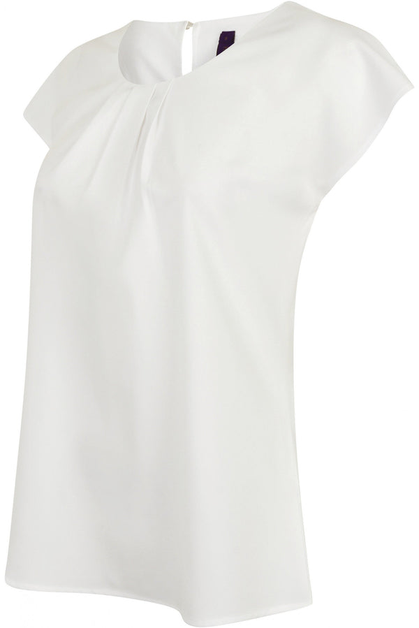 100% Cofrex Polyester Pufy®: innovative fabric with a cotton touch. anti-UV. breathable and quick-drying. that does not create creases. Neckline with decorative folds and button at the back. Short sleeve. Right hem. Easy treatment. Weight 115 Dimension
