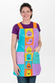 Teacher's apron made of stretch denim. Divider pocket with a fun dinosaur print. Contrasting orange and green straps and side straps with buttons for fastening.