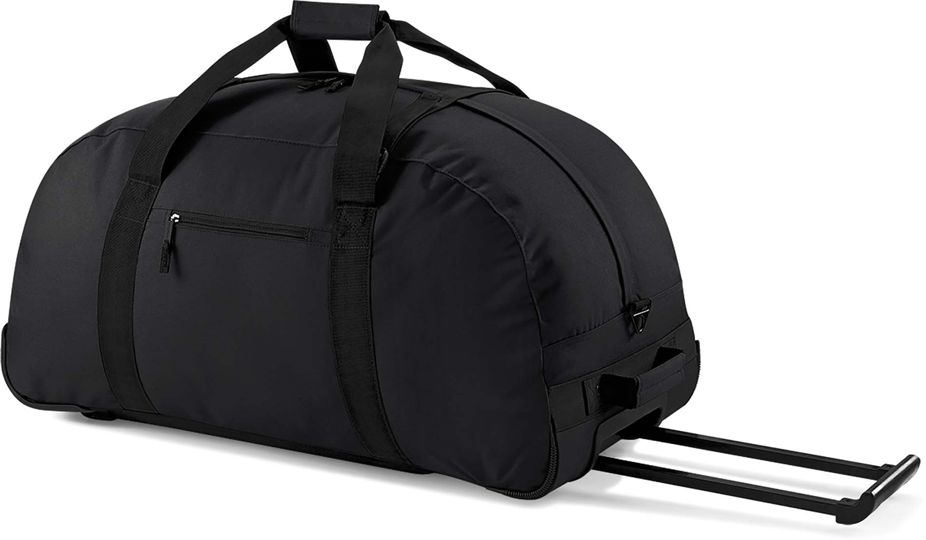 600D polyester. Trolley system. High strength integrated wheels. Adjustment straps. Zip bag. Detachable and adjustable shoulder strap with shoulder pad. Padded comfort grip. Transport handle. Weight 390 Dimension 75 x 38 x 35 cm