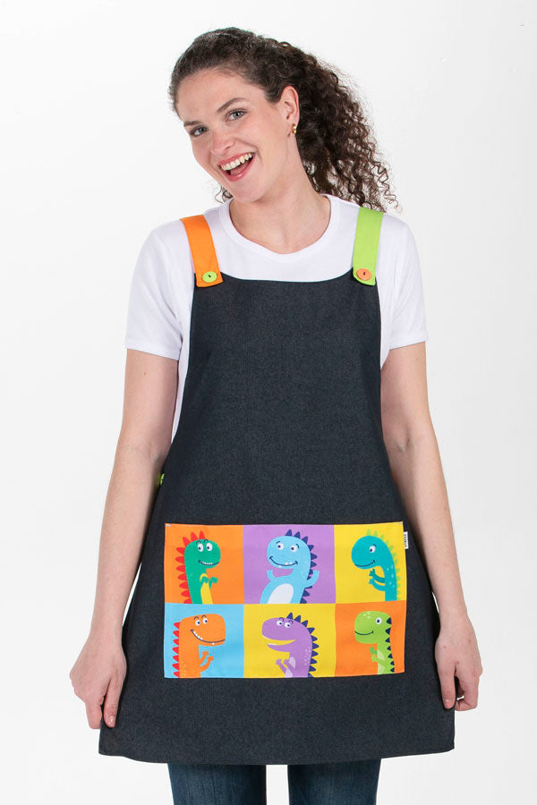 Teacher's apron made of stretch denim. Divider pocket with a fun dinosaur print. Contrasting orange and green straps and side straps with buttons for fastening.