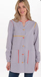Product Description Sleeveless teacher's smock with zipper closure. Made from a navy blue checkered fabric. Contrasting bright red on the armholes...