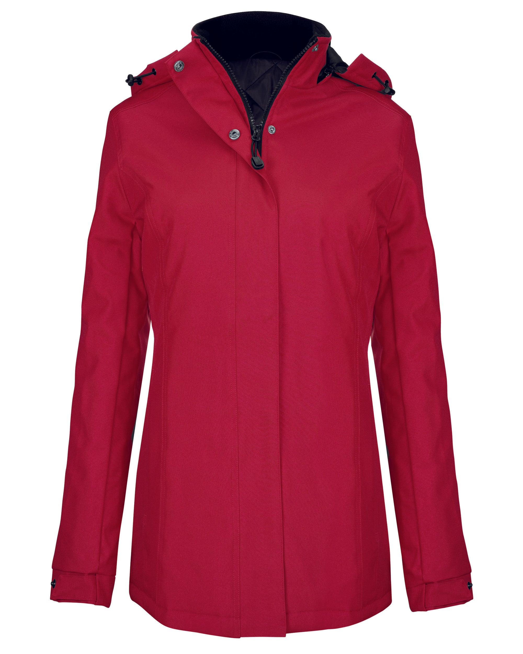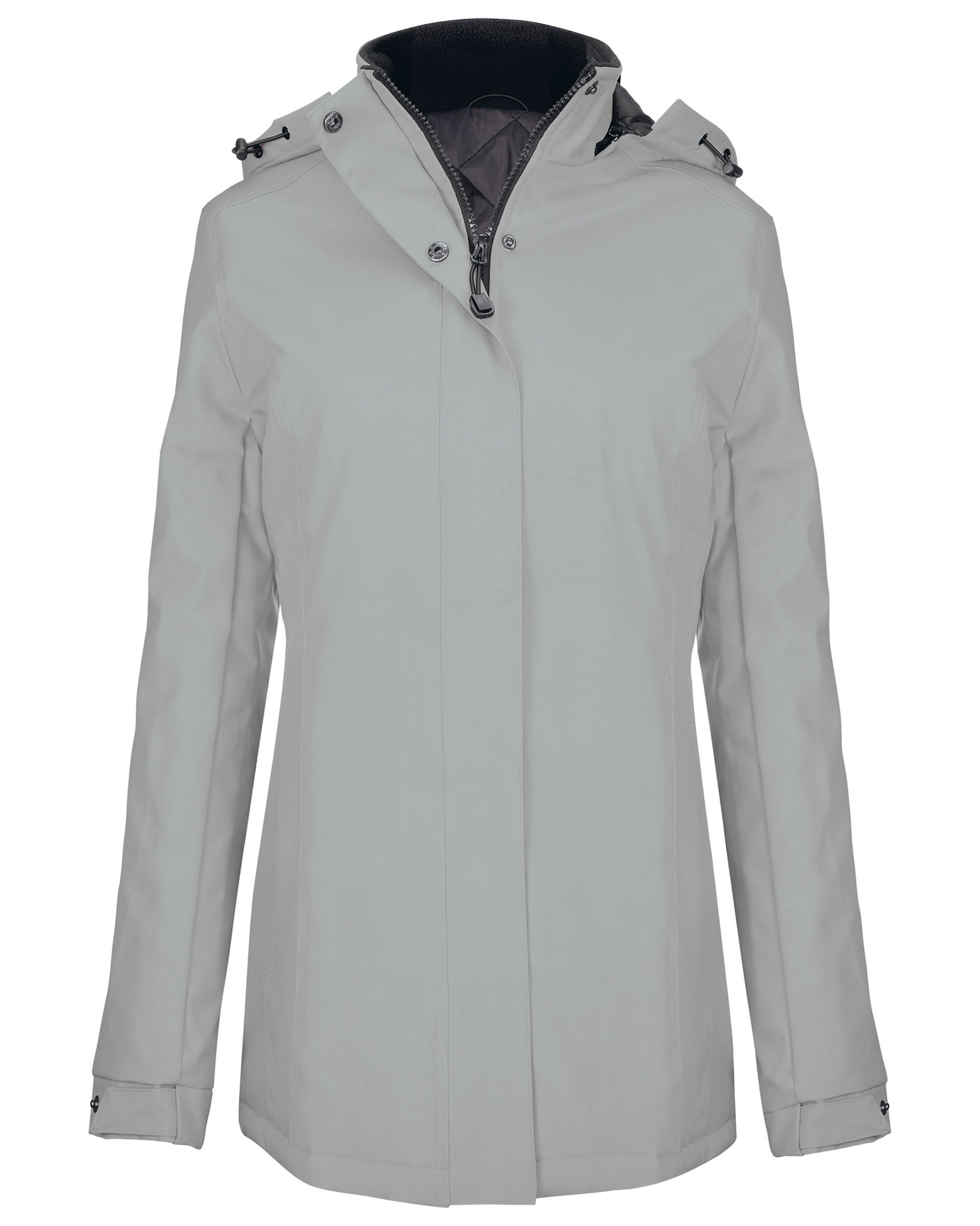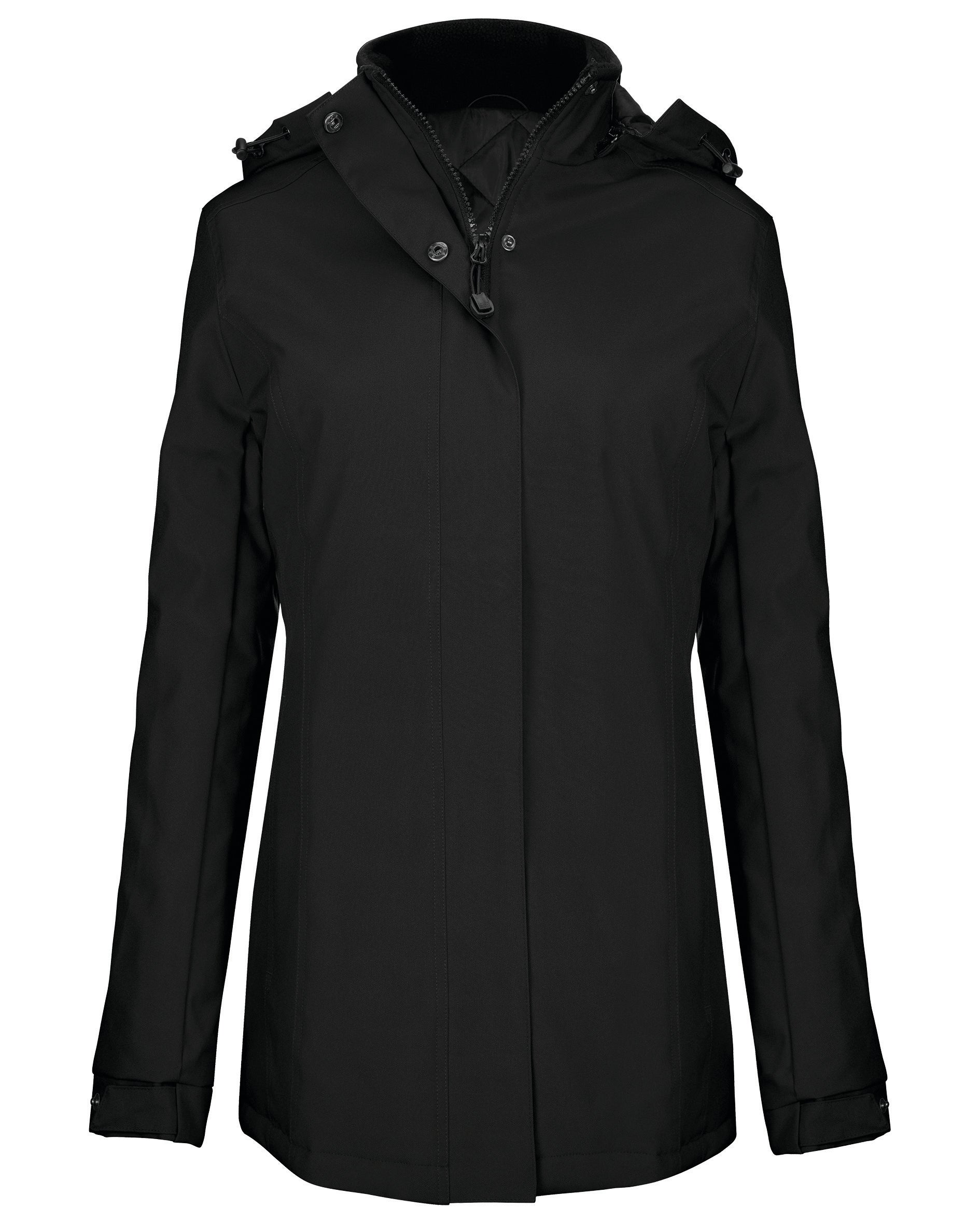 Exterior: 100% Oxford polyester. Interior: quilted polyester. With invisible snap closure and flap. 2 external zip pockets. 1 internal pocket. Removable hood. Fleece-lined collar. Zipper closure for customization.