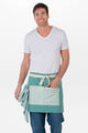 A wrap-around apron made in two matching tones. It is fastened with a beige herringbone ribbon crossed at the back with antique gold metal eyelets. A loop at the pocket is for hanging the cloth. An internal ribbon is also provided for hanging the apron.