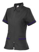Short-sleeved, collarless tunic for aesthetics and commerce. Fixed with brackets. Double color contrast piping on sleeves and pockets. Length 70cm.