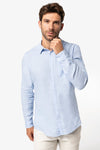 100% linen. Fair cut. Classic placket with pearl effect buttons. Left chest pocket. Fit on the back with clamps. Cuff with button. Contrast in Natural color on the inside of the collar base. The Linen color has not been dyed, so it may vary from product to product.