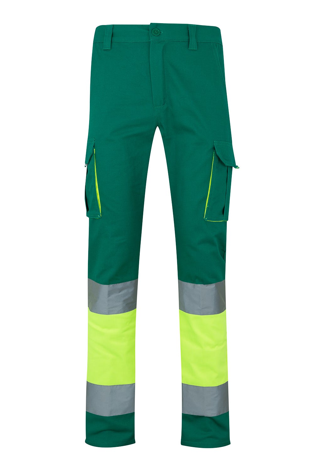 Central zip and button. Reflective strips on the lower legs. Contrasting color on the bellows, pulls, loops and fabric between the strips. Elastic waistband. Double security stitching. Six pockets: 2 French pockets. bellows, with double central bellows, flap, velcro and pulls. 2 back pockets with flap, velcro and Twill pulls. 100... Weight 240 gr/m2 Dimension