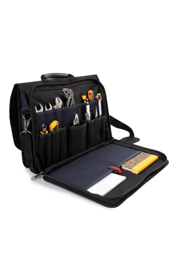 100% polyester. Bag with adjustable shoulder strap. Organized tool holder compartment with spaces for different tools. Flap with front pocket for easy customization. Large main compartment for storing documents and a computer up to 15 inches. The bag is reinforced to support the weight of adapted contents.