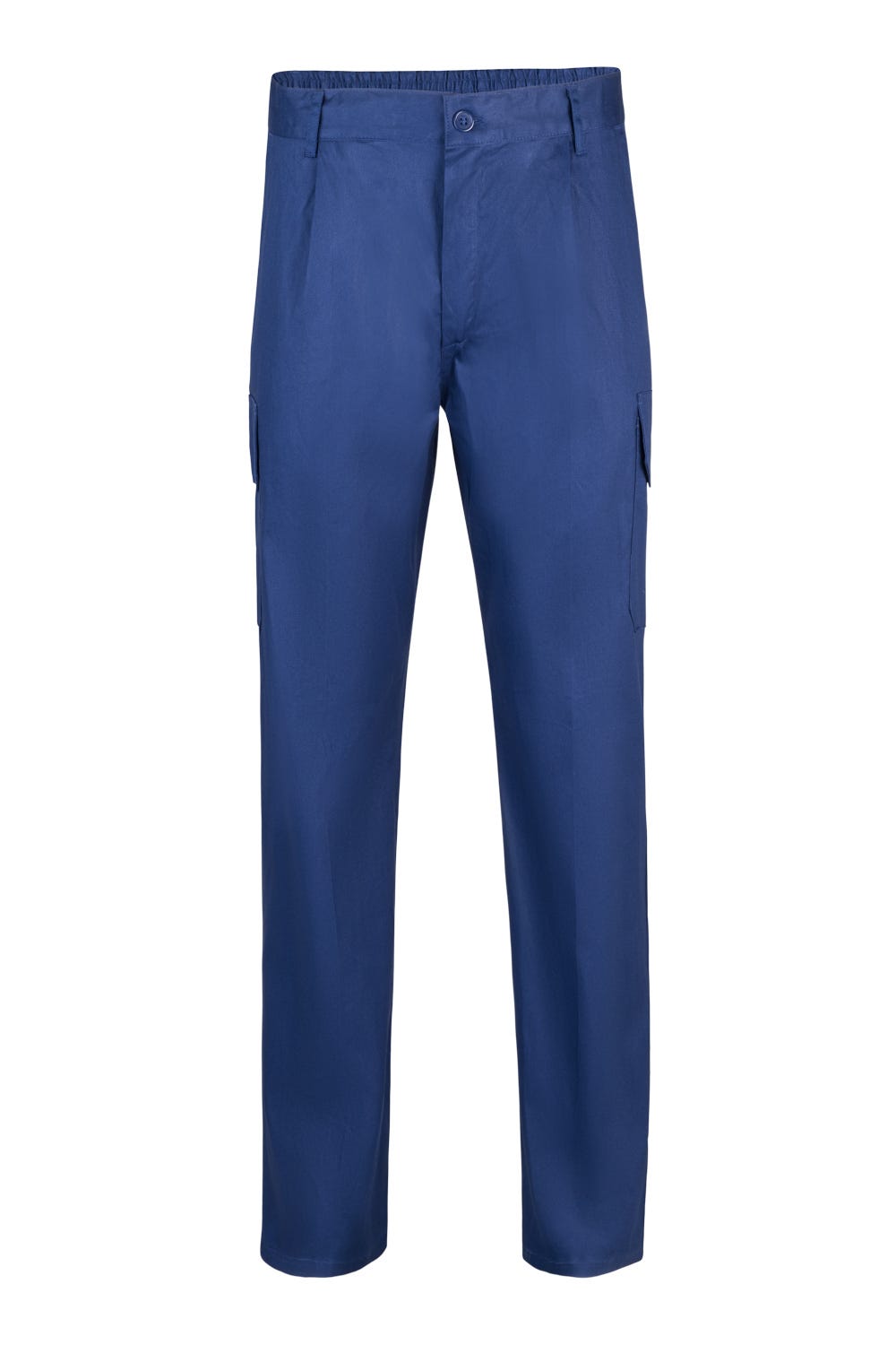 Zipper and button. Elastic waistband. Rear seam security. Tweezers.. Six pockets: 2 French pockets. 2 patch pockets, with central bellows, flap and velcro. 2 rear bellows pockets, with flap and Velcro Twill. 100% cotton Weight 180 gr/m2 Dimension