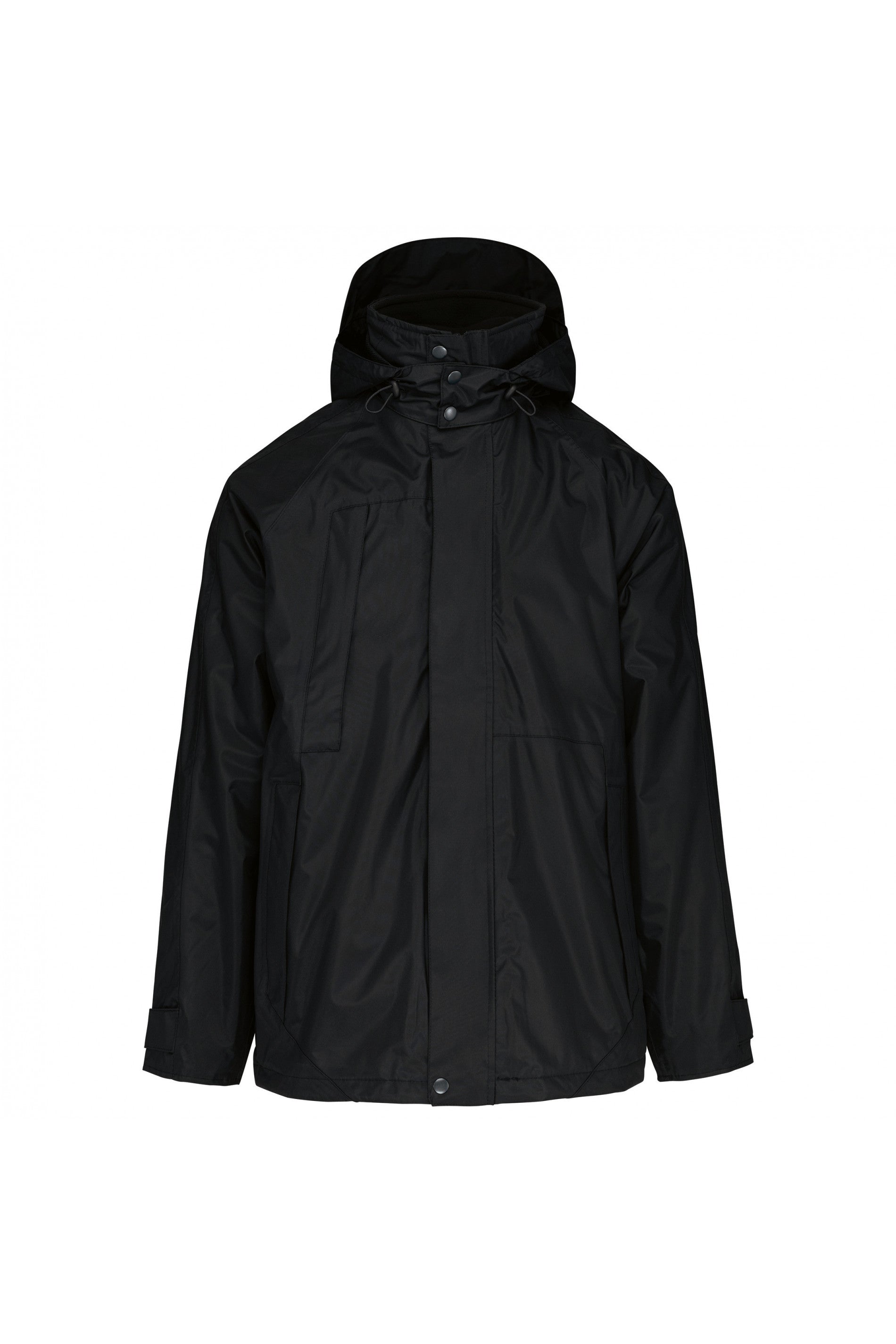 100% Polyester with waterproof seams. Jacket: 100% Polyester. Heat-sealed seams for waterproofing. Lining: 100% Polyester. Removable hood. 4 front pockets. Fleece lining in the collar. Zipper closure for customization. Fleece jacket: 100% Microfleece polyester. Full zip. 2 side pockets. 3 in 1. Can be used as a parka only.