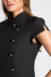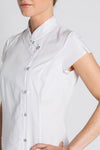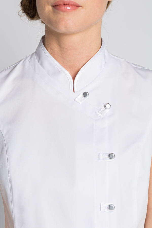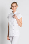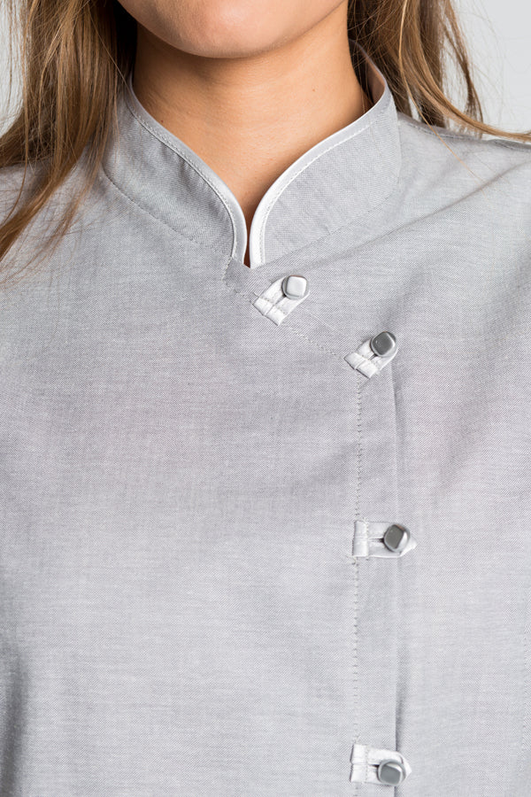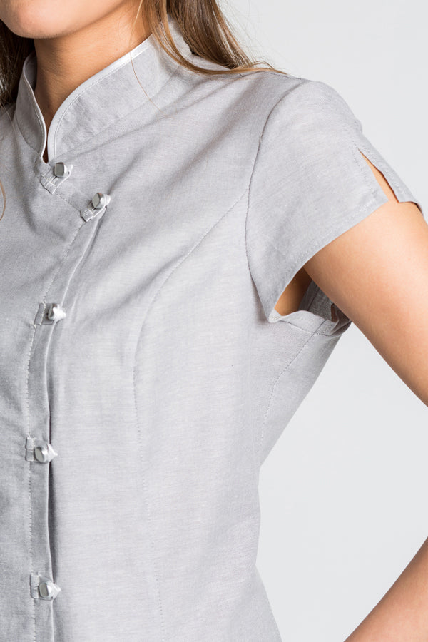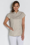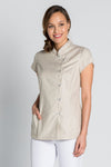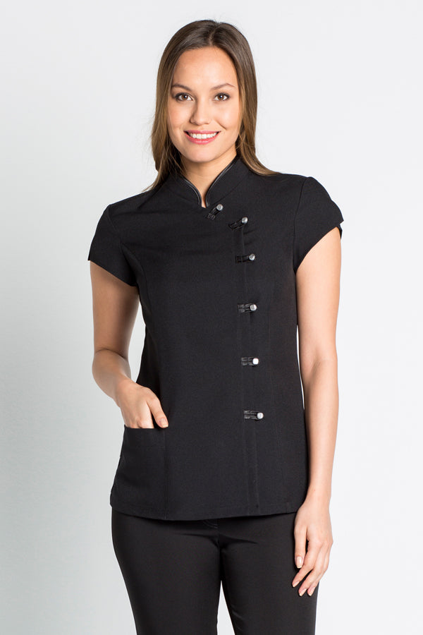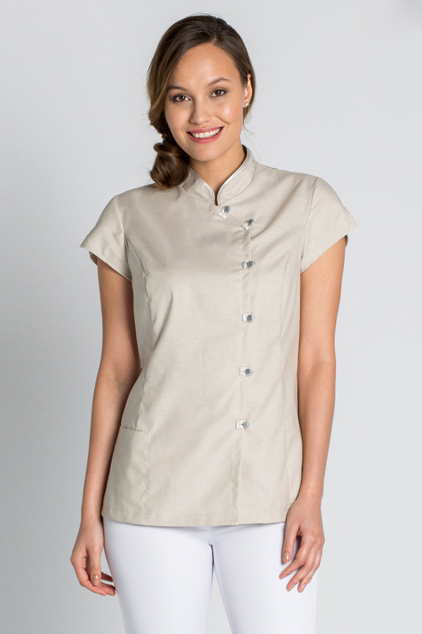 Short-sleeved tunic for commerce and aesthetics. Fastened with a square button. Mao's neck. Length 66 cm.