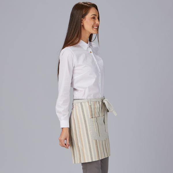 The Short Apron with Combined Stripes was designed for professionals who value a balance between modernity, functionality, and comfort while working. With an elegant light gray stripe pattern, it's the ideal choice for professional environments that require careful presentation, such as hotels, restaurants, and commercial spaces.