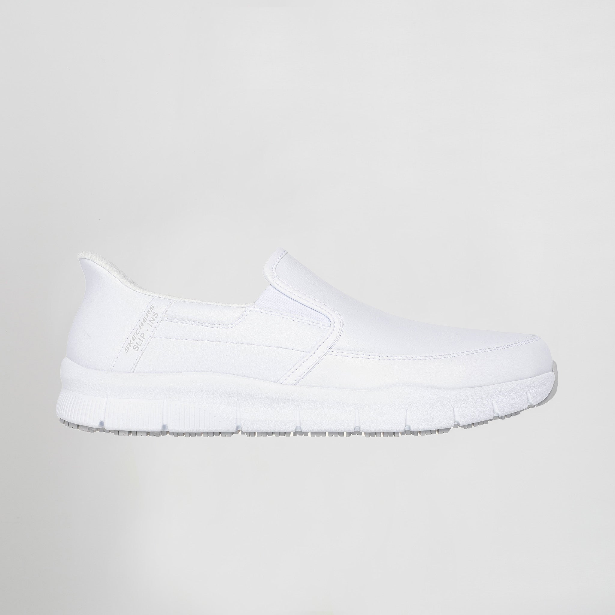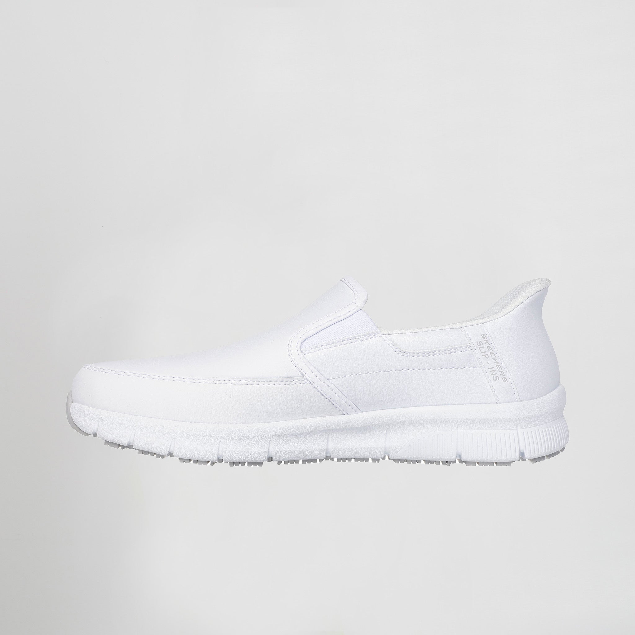 A sua construção inovadora integra a tecnologia exclusiva Hands Free Slip-ins®, permitindo calçar os sapatos de forma rápida, sem as mãos, ideal para rotinas corridas e para garantir máxima higiene. O suporte adicional do Heel Pillow™ assegura que o pé permanece perfeitamente ajustado e seguro durante todas as atividades. A parte superior em pele lisa, complementada por painéis duplos elásticos laterais, proporciona um ajuste moldável e confortável, ajustando-se a diferentes formatos de pé.