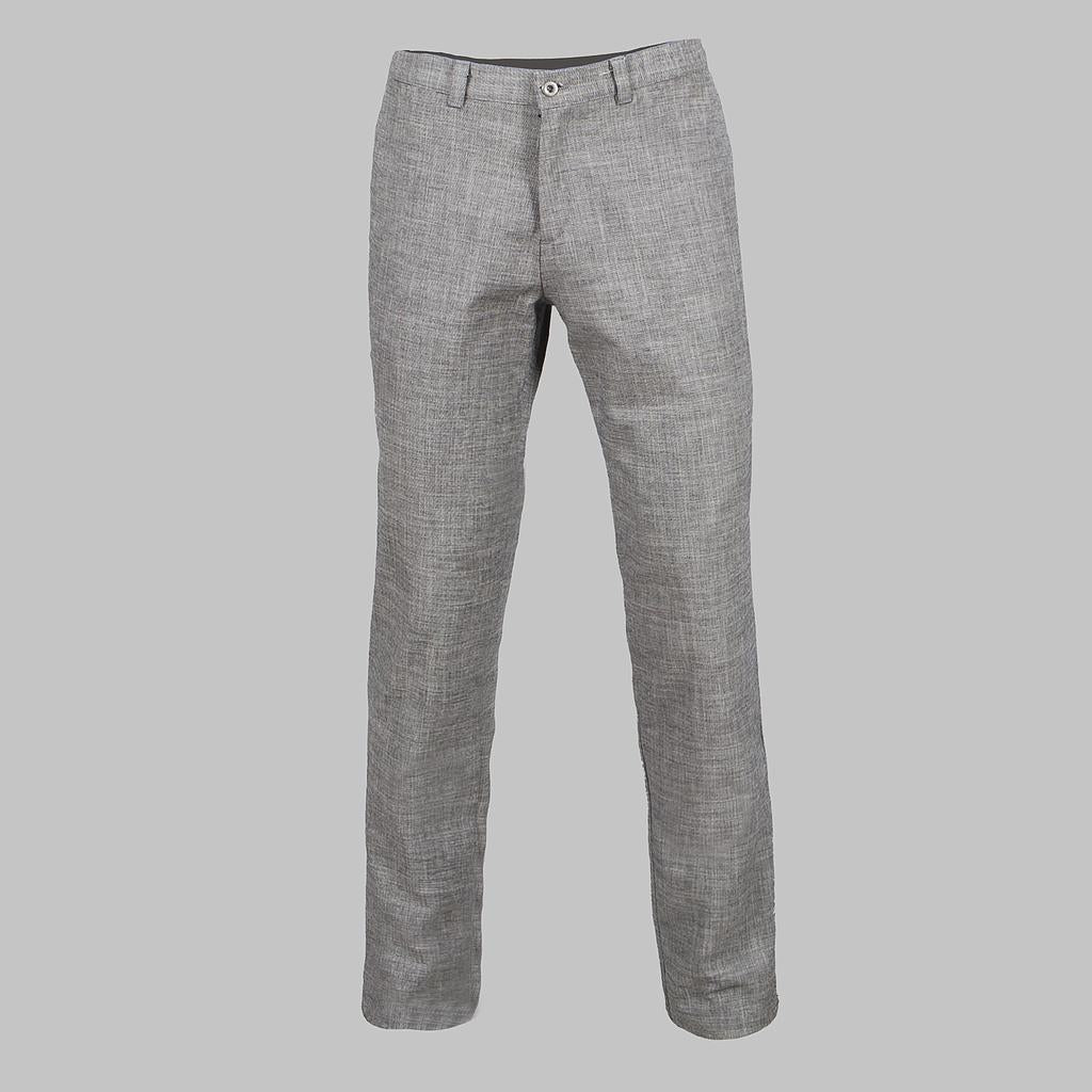 Men's fitted trousers with two front pockets and two back pockets. Features belt loops at the waist and a button and zipper closure at the front. No front darts. Made from CHEVIOT (270gr/m²) 97% Cotton - 3% Elastane, a stretchy fabric that ensures comfort and freedom of movement. The unstructured texture of the yarn provides elegance and an informal touch. Ideal as a waiter's uniform for bars, restaurants and cafes, reception, transport, office or retail.