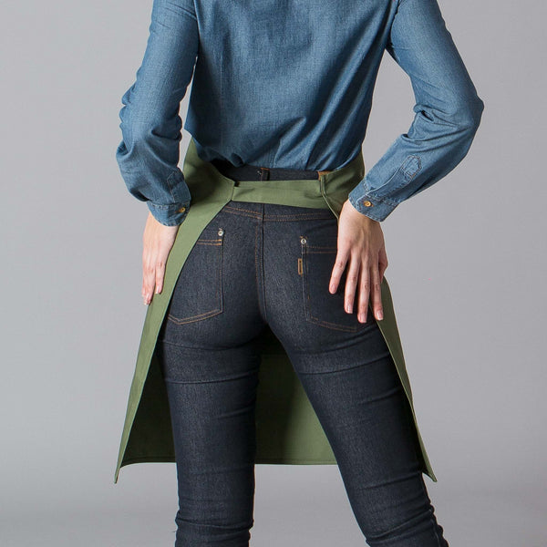Apron with chest pocket for pens and two central pockets in the hip area, one superimposed on top of the other...