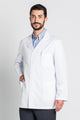 Smock for women made from white microfiber. Long sleeves and lapel collar. Fixed with washer brackets. Two lower pockets and one upper pocket. Length: 96cm. Very light fabric, soft to the touch, quick drying and easy to iron