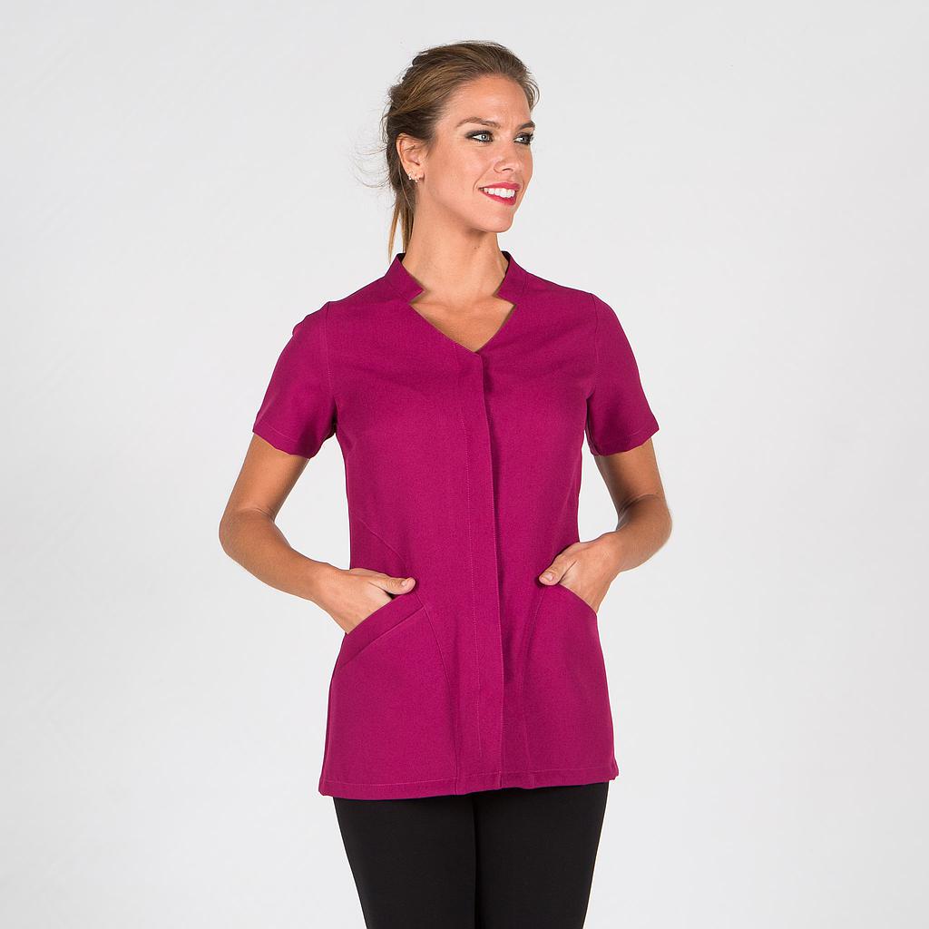 Women's short-sleeved tunic with a tank top neckline, peak neckline, concealed snap button closure, and two side pockets, one of which is double. Semi-fitted garment with darts at the shoulder seams and back. Made of 100% polyester stretch fabric, available in seven different colors. Ideal as a uniform for hairdressers, beauty salons, spas, healthcare, pharmacies, veterinary clinics, or general retail.
