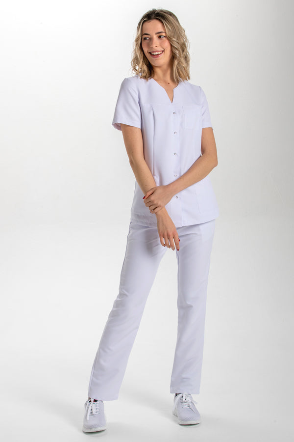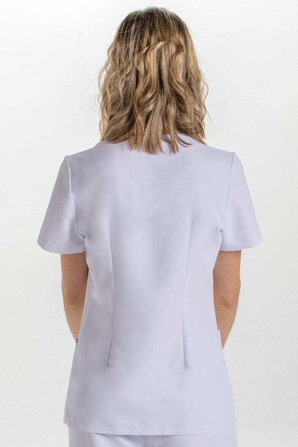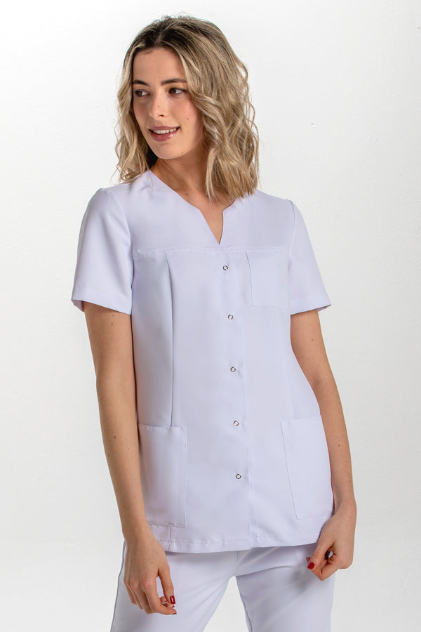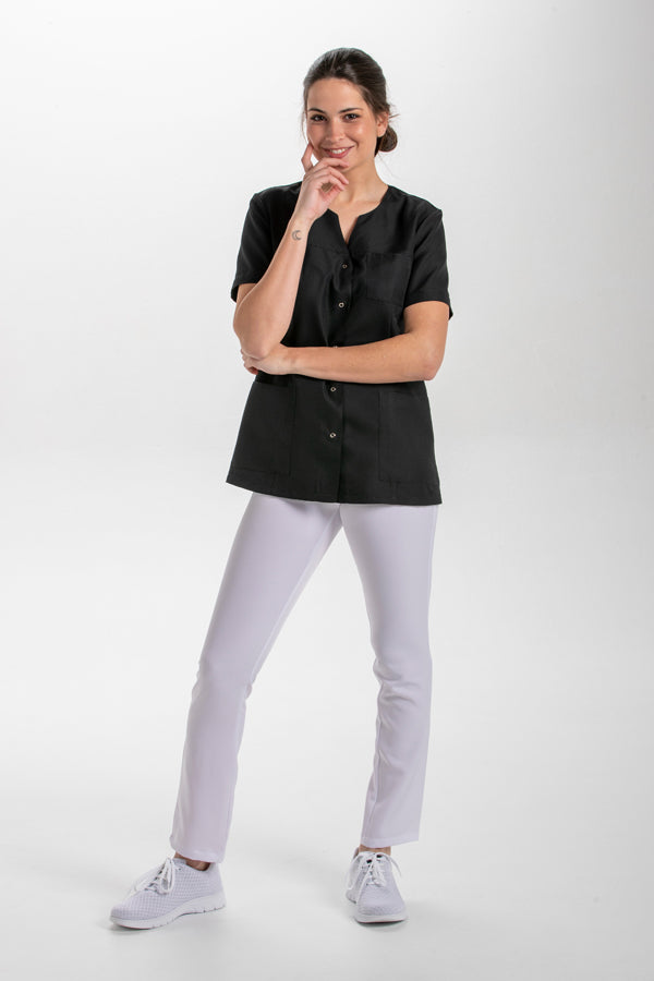 Women's microfiber tunic. Short sleeve. Fitted piece with hook-and-eye closure and topstitching on the chest. It has two lower pockets and one on the chest. Length: 70 cm. Size: SP-PMG-SG-SSG-XL. Soft fabric to the touch, very light and easy to iron.