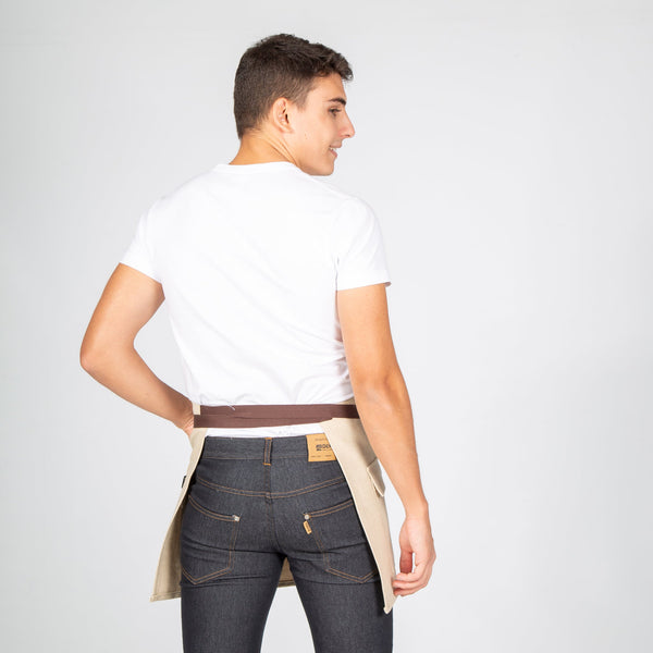 Delantal corto con dos bolsillos delanteros. Dispone de tiras laterales para hacer nudos. Ideal para uniformes de bar, restaurante, cafetería o tienda.
