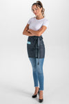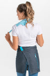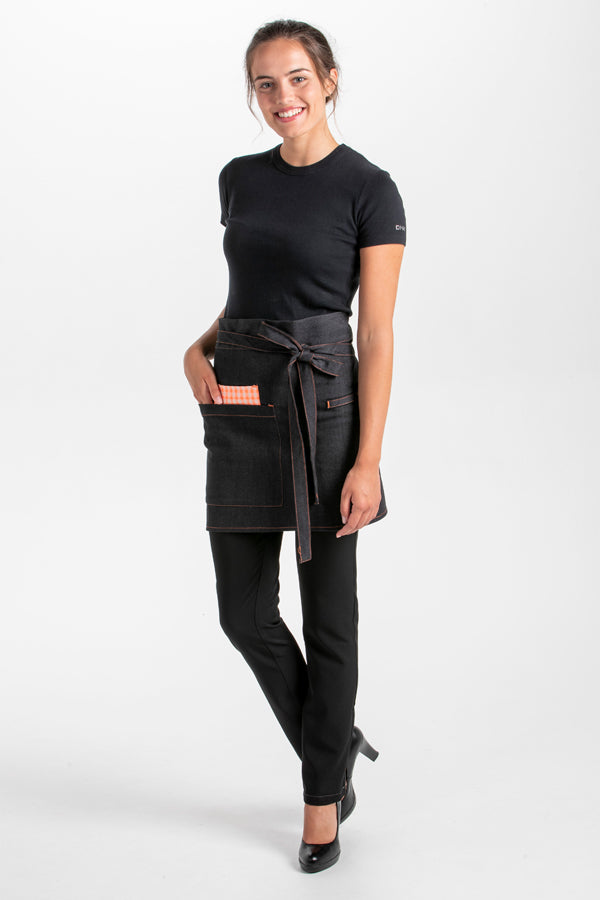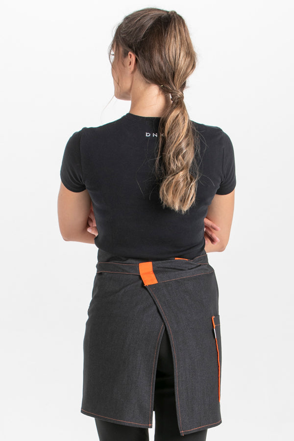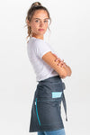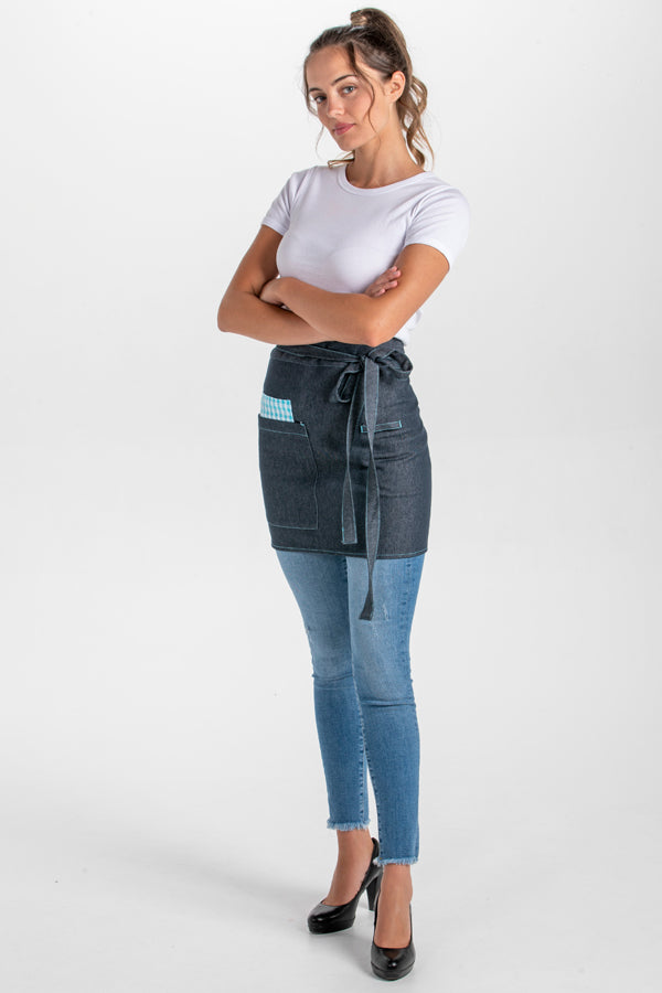 Delantal corto en jeans con contraste en bolsillo y cintura. Cintas para ajustar jeans. Bolsillo grande con otro interior de caja a contraste.