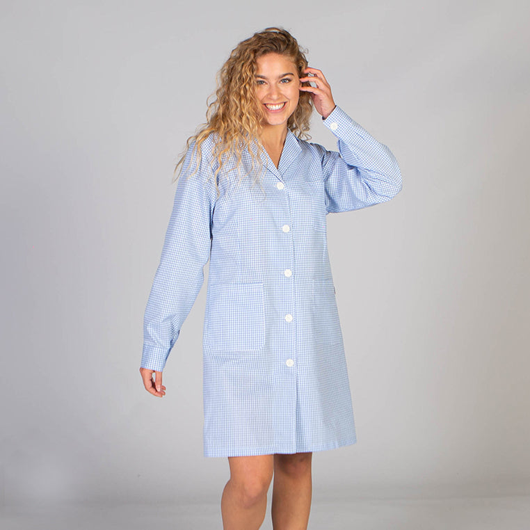 Abra el vestido de mujer de manga larga con botones visibles. modelo semi-bedero, con pinzas en la parte delantera y posterior, cinturón en la parte posterior y puños abotonados. Tiene un bolsillo en el lado izquierdo del cofre y dos bolsillos de parche en la cintura. Disponible en rayas o cuadros en azul claro, azul y verde. ideal para uniformes de limpieza generales.
