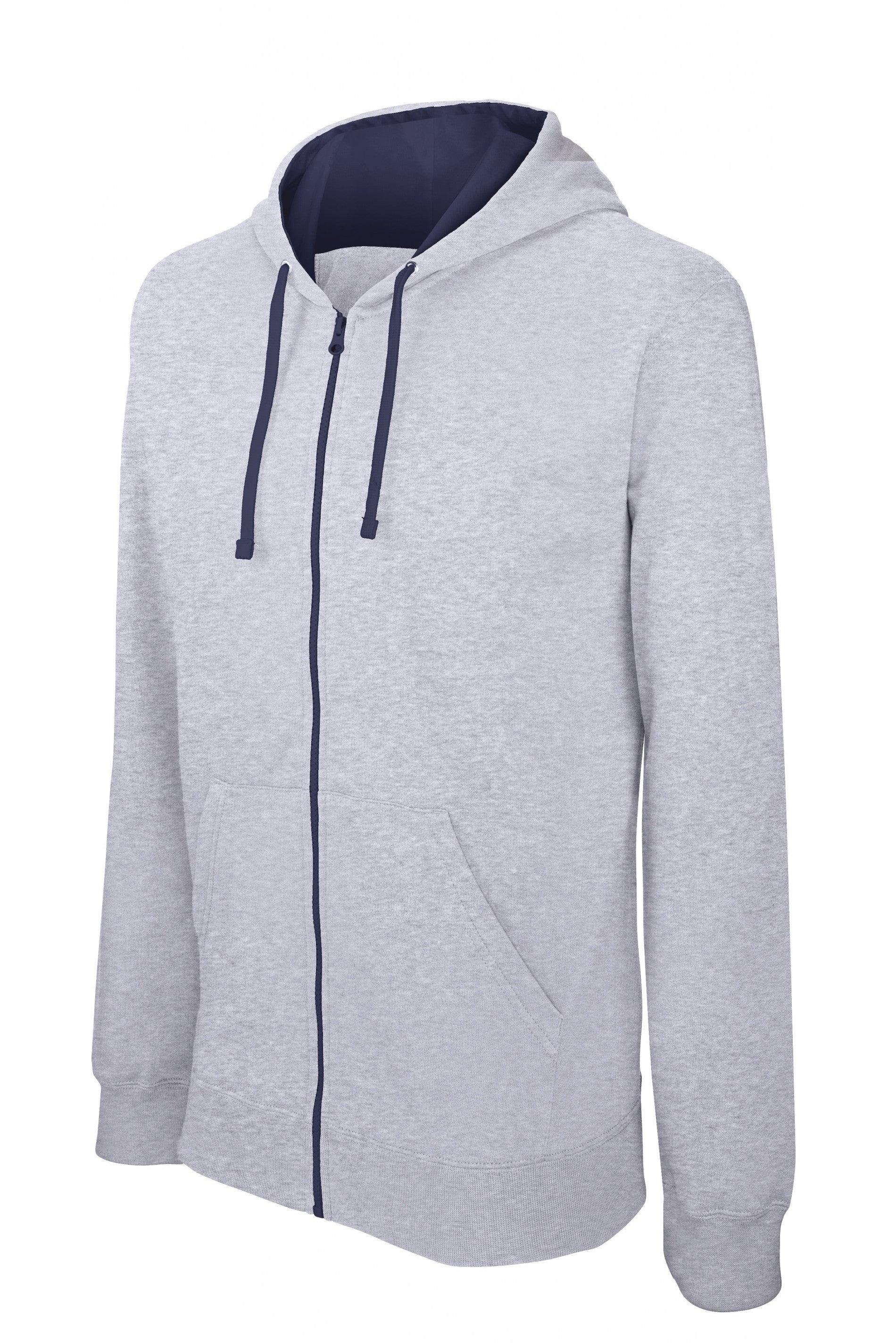 80% algodón peinado / 20% poliéster. Interior cardado. Bolsillo canguro con orificios de acceso para auriculares. Acabado de mangas y cinturilla en punto de canalé. Capucha forrada en contraste con cordón. Cremallera en contraste. Gramaje 280 Dimensión