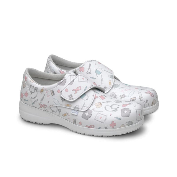 Un nuevo modelo de calzado higiénico ultraligero (195 g por pie), hecho en microfibra transpirable e impermeable, vegana amigable y suela de Comfortlight, regresa al diseño con motivos médicos, ya incorporado en mycrom.