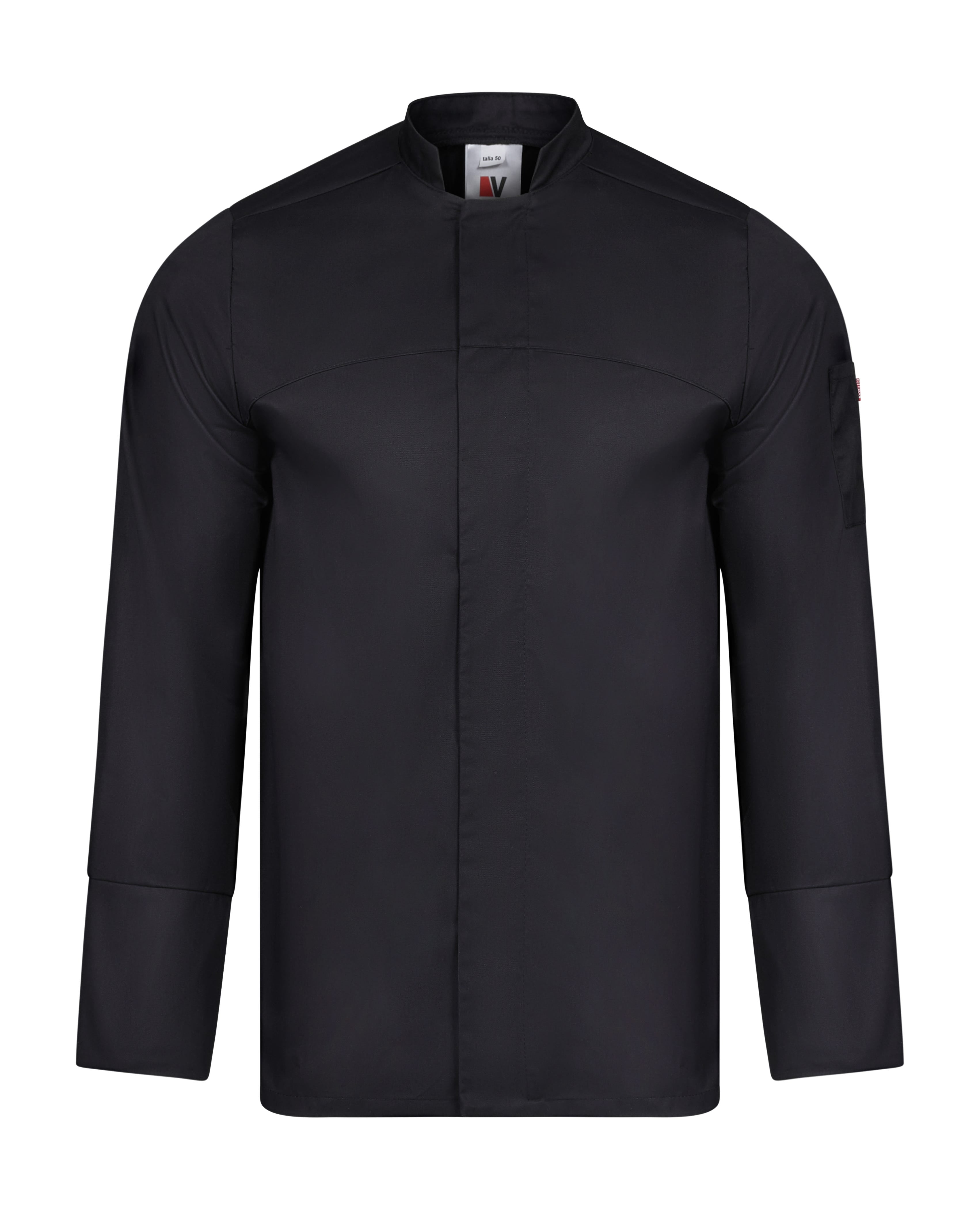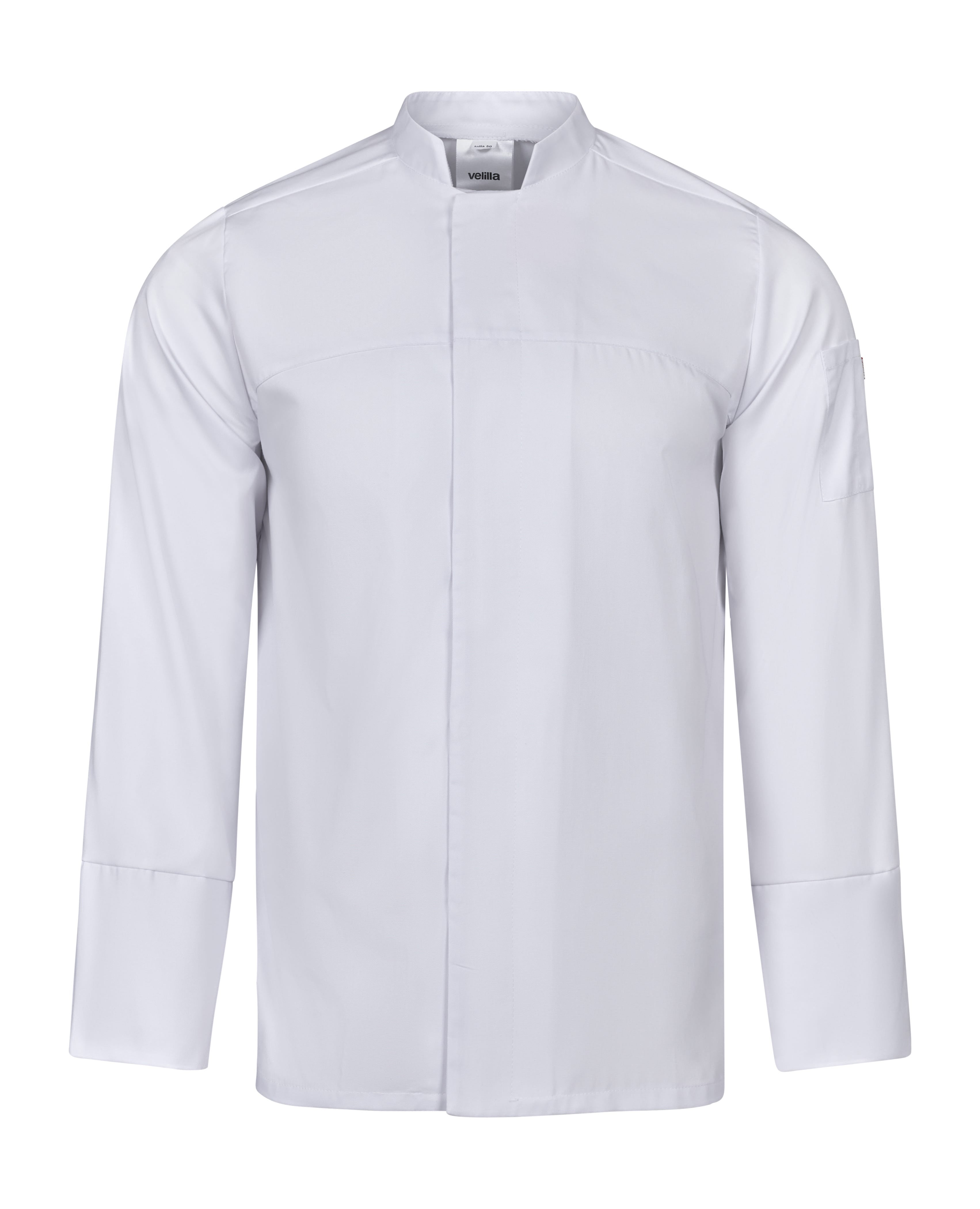 Central zip con botones automáticos ocultos. Collar de mano. Manga a medida con la apertura en los puños. Un bolsillo: 1 bolsillo de parche en la sarga de manga izquierda. 65% de poliéster - 35% de peso de algodón 190 gr/m2 dimensión