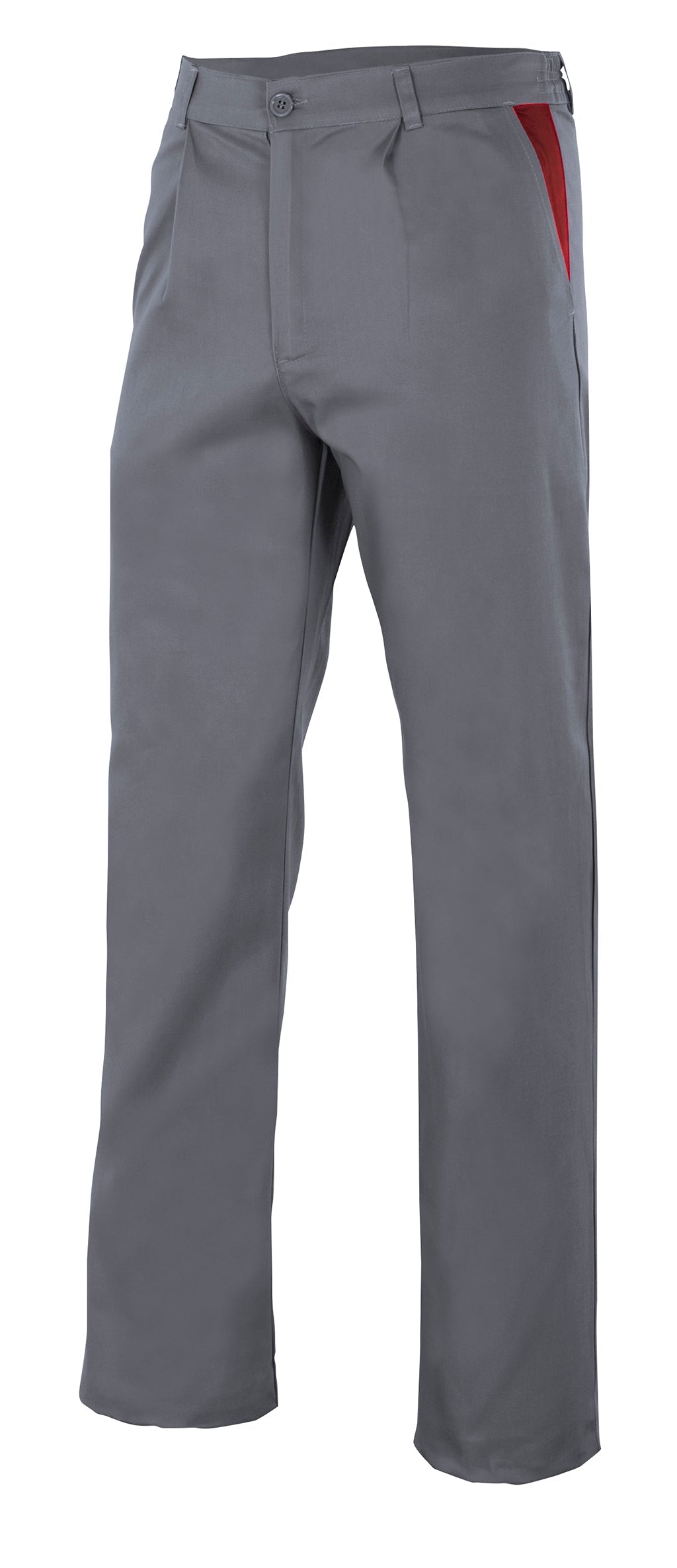 Pantalón con pliegues y elástico en cintura trasera. Dos bolsillos franceses y uno trasero con solapa y botón. Costuras de seguridad traseras. Tela asargada. 65% poliéster - 35% algodón Peso 190 gr/m2 Dimensiones