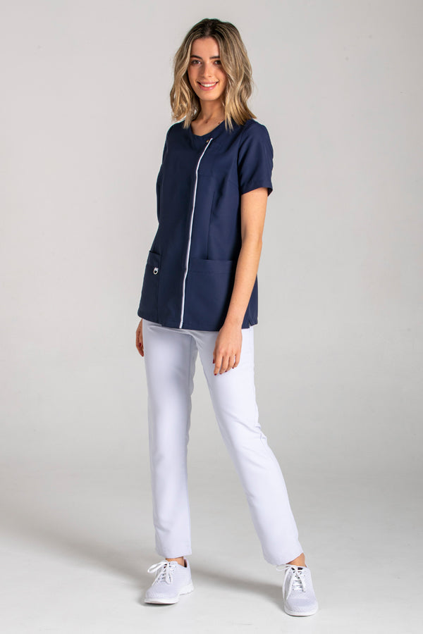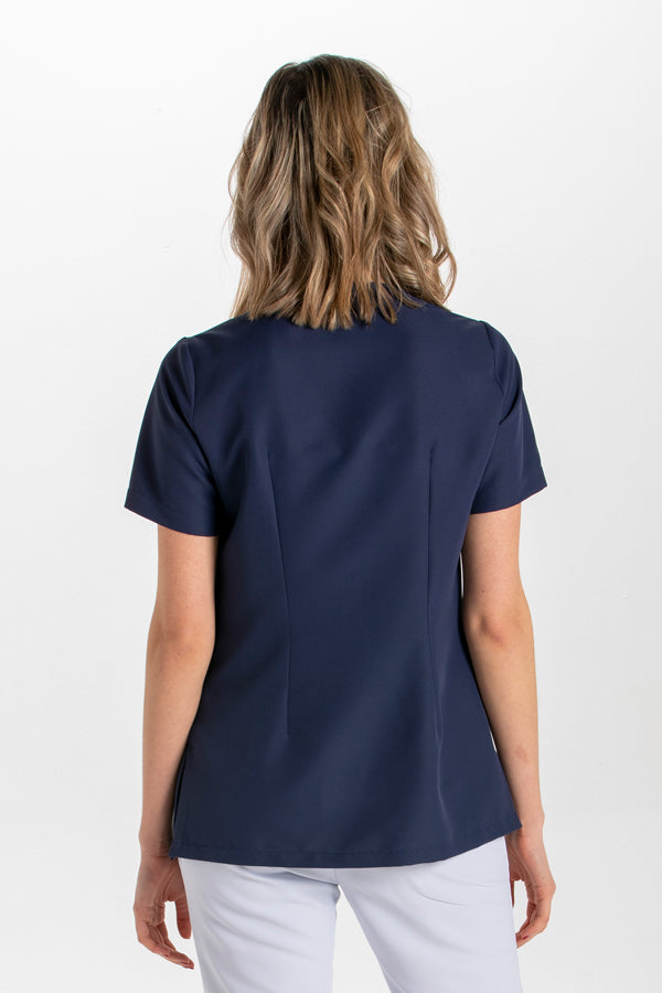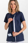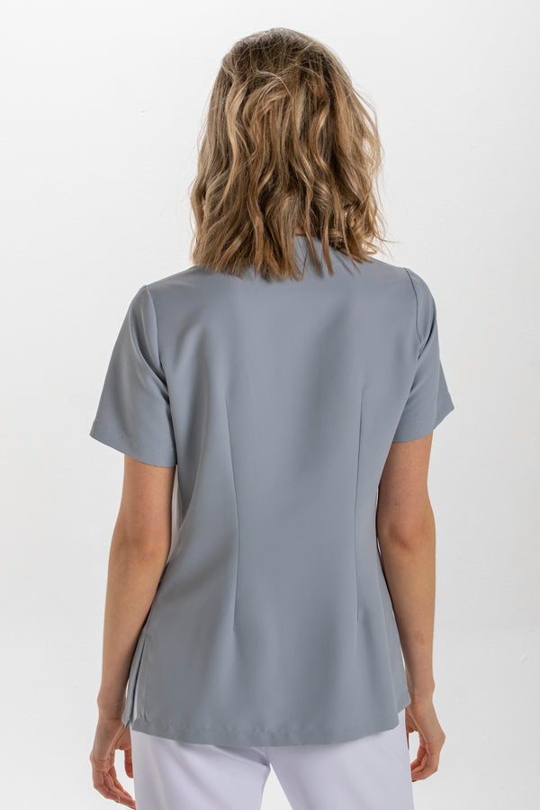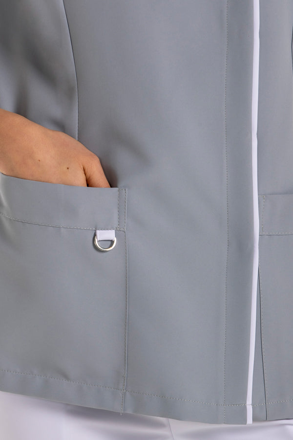 Blusa de microfibra femenina. manga corta. con ganchos ocultos en la capa en gris claro para contraste. accesorio en uno de los bolsillos para colgar la acreditación, dos bolsillos inferiores y un bolsillo de pecho estrecho . Ventils laterales inferiores. longitud: 71 cm. Tamaño: SP-PM-G-SG-SSG-XL. Muy ligera pieza, suave al tacto, se seca rápido y fácil de planchar.