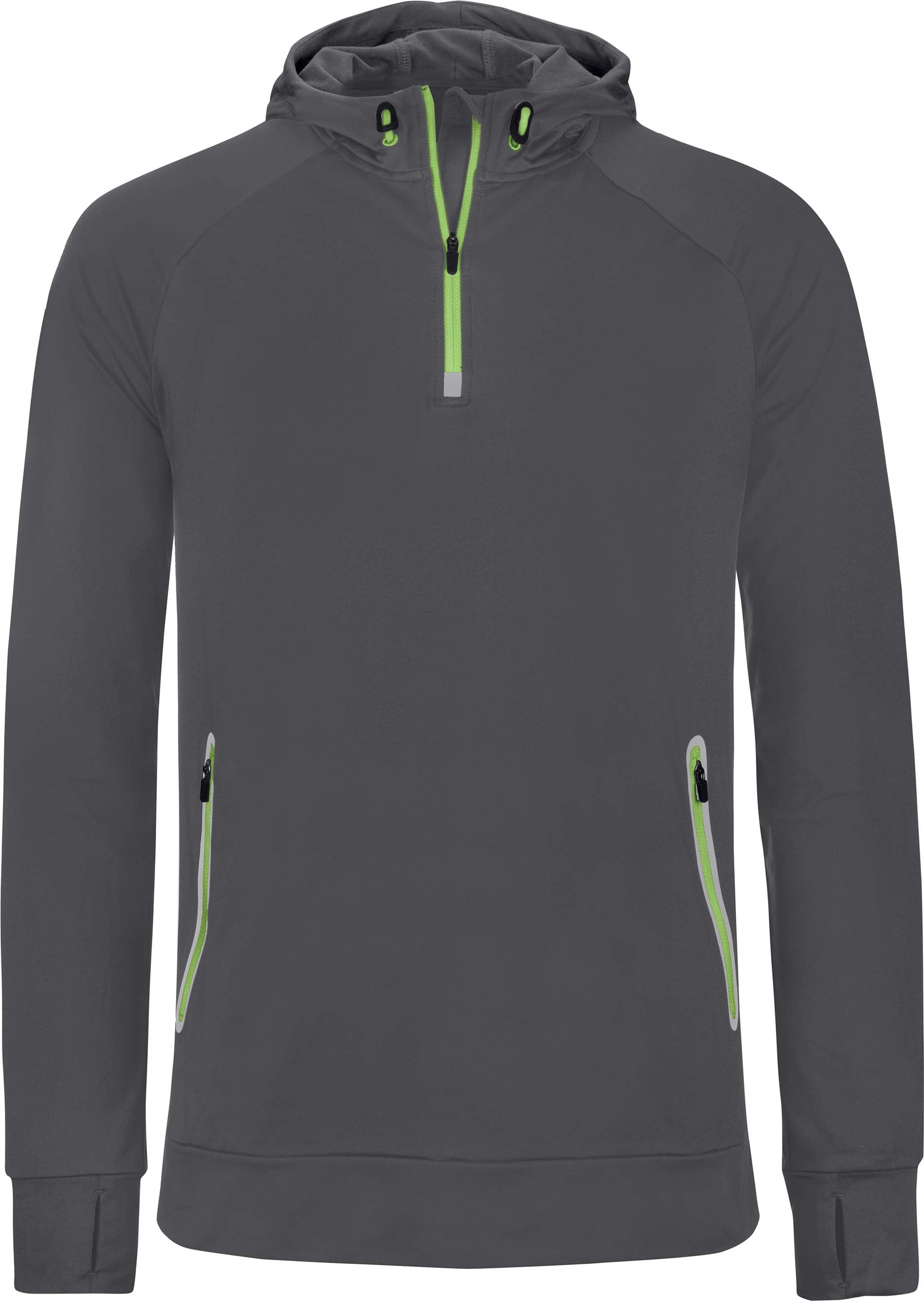 90% poliéster / 10% elastano. Tejido de punto cardado ultrasuave. Mangas raglán. 2 bolsillos con cremallera y reflectores. Cremalleras blancas para color Navy. Negro para el color Rojo y Lima para el color Gris Oscuro y Gris Deportivo Melange. Gramaje 200 Dimensión