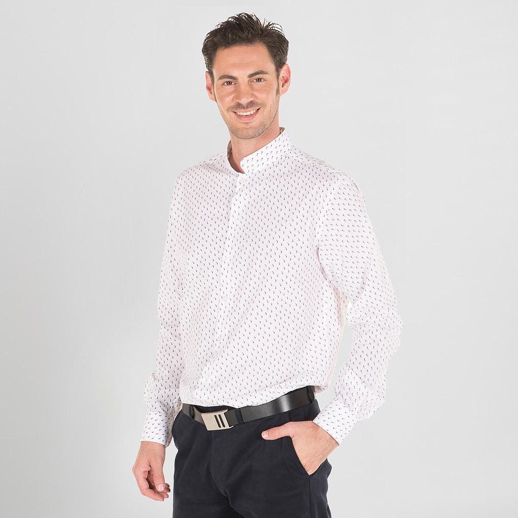 Camisa de hombre de manga larga con cuello mao. Modelo SLIM FIT disponible en varios estampados de topos, lunares o gaviotas. Tiene puños, canesú y pinzas traseras abotonados. Ideal para uniformes de hostelería, restauración, recepción, transporte, oficina o comercio.