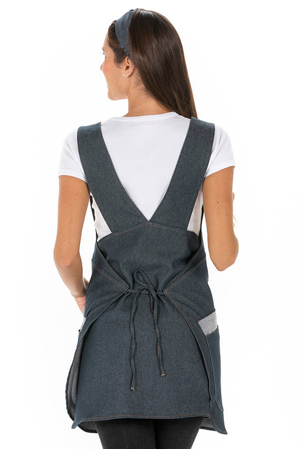 delantal texano con diseño geométrico. Señimiento de dos tonos de costura y combinación de dos tonos. Botones decorativos en las correas....